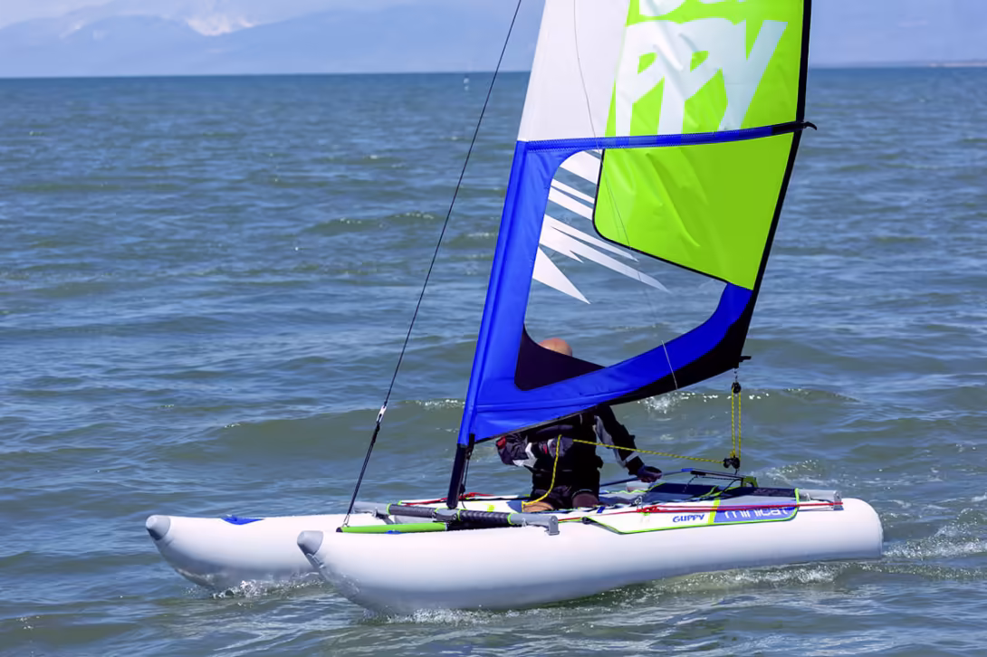 This small inflatable catamaran is equally suited to city dwellers as it is to blue water cruisers: in both cases, the Minicat Guppy is easy to transport, weighing in at just 60lbs (27 kg) and fitting into a storage bag measuring 65” x 12” x 12” (165 x 30 x 30 cm), it’ll slip easily into most cars... and of course on board. Inflated and rigged in 10 minutes, this is the most compact model in the Minicat range - which also includes the 460, 420 and Minicat 310. Despite its 10-foot (3 m) hulls, the Guppy can carry two adults, sail to windward thanks to its two 20” (50 cm) removable skegs, and even reach speeds of 15 knots in a good breeze!