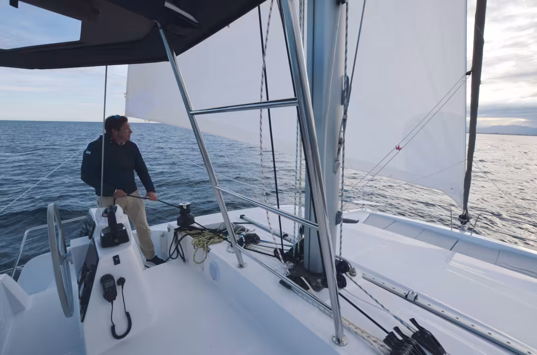 From the dock, one step is enough for me to embark easily - so I hop onto the sugarscoop, climb the few steps, and immediately fall under the spell of this space that opens up right to the foredeck. The ventilation is surprising and dispenses with the need for any air conditioning (except for the cabins). The through-vision is very pleasant. With the low autumn light, the sun illuminates the aft lounge-dining room. It feels like a winter lounge, the sofa or the club chairs stretch out your arms and the table is already laid. The chilly wind forces us to close the hydro-electric rear bulkhead and in this warm atmosphere, we would gladly sit down. However, outside, Boris hoisted the self-tacking solent and here we are hard on the wind in fourteen knots true, with ease! Passing to the galley and the foredeck is done without any problem, even with numerous people on board. En route, you can grab something from the double fridgefreezer. As I join the crew, I pass the barbecue integrated into the sidedeck: gastronomy is clearly taken very seriously! Getting on and off the flybridge forward is easy and super safe - ideal for accessing a mini “Portuguese bridge” (a perfectly protected outside walkway) which incorporates all mast-foot sail maneuvers. Just aft, the helm station, then a lounge area and finally a nice sunbathing area. From this deck bridge, you can keep a course while trimming sails. The mainsail and self-tacking solent sheets are within easy reach. You can even bring back (via the deck winches) the furling lines and the gennaker or spinnaker sheets on the two electric winches. All maneuvers are therefore manageable from this bridge, disturbing neither the helmsman, nor those enjoying the deck saloon or lazing around in the sun. Brilliant!