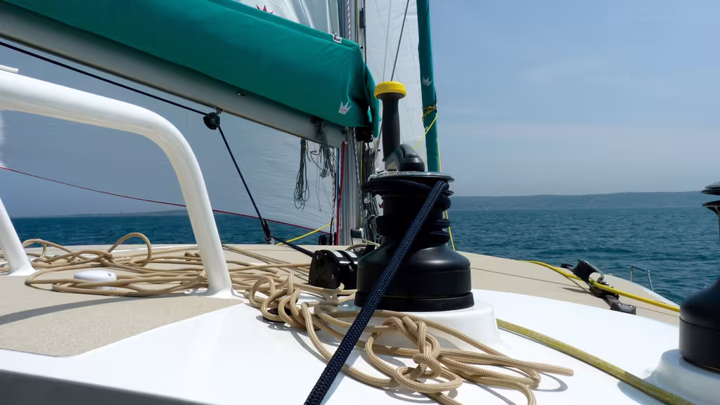 To port, the cockpit has a modestly-sized table, at which only the lateral occupants benefit from a backrests. But movement is easy and we were impressed by the rigid bimini/solar panel support/dinghy davits/articulated outboard lifting mast assembly! It is very strong, as it also supports the mainsheet track and the significant forces which go with it. Very practical, as although a good dinghy with a good engine is the essential guarantee of a successful cruise, this is even truer when the boat becomes a home. And to make things even better, everything is remarkably well-finished. Here, just as on the deck and the coachroof, the paintwork is particularly successful. Antonio, the builder’s technical manager gave a little cough when talking about the number of hours they had to spend on it, but the result is really convincing. The steering position, to which most of the control lines are returned, is positioned to starboard of the coachroof. Moreover ‘Mandala’ is equipped with an electric winch, which we quickly found essential. Result: all the manoeuvres can be carried out singlehanded with no difficulty. Starting with hoisting the mainsail, whose 2:1 arrangement on the headboard is essential to reduce the effort, but doubles the length of the halyard. The only snag: why have the jammers been positioned so far forward? Their position obliges you to stand on the tips of your toes to activate them with an outstretched arm, unless you are built like a giant! A shame! Similarly, we regretted the fact that the steering wheel is too close to the engine controls. I am afraid that you will inevitably trap your fingers when the controls are in neutral. These are the only two slight problems, (which can be easily corrected), in a strategic place for the programme, which brings together all the qualities. Thanks to the cleverly positioned difference in level, at the helm you are either very well protected from the elements, or in sight of the sugar scoops and bows, for precise manoeuvres when entering and leaving a port. These are made easier by the very well chosen 40hp Volvo saildrive engines and manoeuvrability which belies its overall size. At 1800 rpm, we were doing 6 knots on a flat sea, a guarantee of low consumption. At 2500 rpm, the speedo got up to 7 knots, a guarantee of being able to find shelter as quickly as possible, if necessary. All the control lines are within reach and the steering wheel is one of the best. As long as you make sure you are close hauled, with a minimum amount of speed, the boat tacks with no problems. The 17m mast carrying the main and genoa (which will ideally be completed by a staysail on an inner forestay) is strongly supported by generous standing rigging, reassuring in all circumstances. Speed lovers would have perhaps liked a higher aspect ratio and larger sail area, but this isn’t the priority here. The Banana has to stand up to sudden gusts with full main, serenely, and the stockier rig guarantees more open shroud angles and therefore better support.