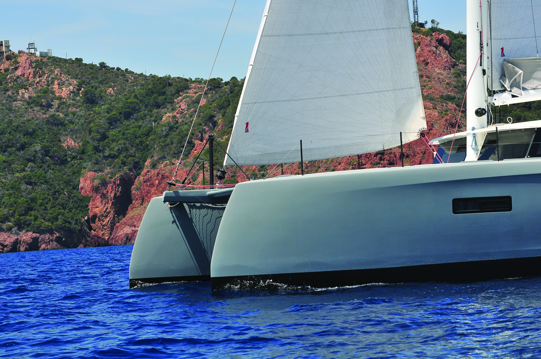 "The general idea was to create a boat that slips through the water. Speed is not a criterion in itself, but a guarantee of safety and a consequence of the boat's seakeeping qualities: essential for a sailing catamaran with an offshore program. These two criteria form the basis of the design. Of course, the comfort aspect of the boat must be kept in mind during the design phase: people will be living on board for long periods of time. The displacement of the boat is very important in order to have the possibility to install the comfort equipment which is expected in a model of such a high standard. A particular effort has been made on materials and construction techniques: the hulls, the nacelle and part of the deck are infused at the same time. The deck is clear and the superstructures non-structural, allowing the coachroof to be opened wide to the sea and limits the weight aloft. In short, a boat that accelerates in gusts and waves rather than heeling and coping with stress. The underwater hull form is at the heart of this philosophy and derives from practical experiments, carried out in particular on the Pandora 8.50 and Pulse 600, and hydrodynamic studies conducted on other multihulls. The hulls are relatively beamy and very tight, which is slightly penalizing in light airs, but favors the boat's maximum speeds. The shapes and the very tight keel line make it possible to generate hydrodynamic thrust, to give lift to the bows when the boat is loaded, to limit pitch effects and suction phenomena. It is not about breaking records, but about sailing fast (at wind speed as much as possible), safely and in a comfortable space designed to maximize the experience of life on the water.”