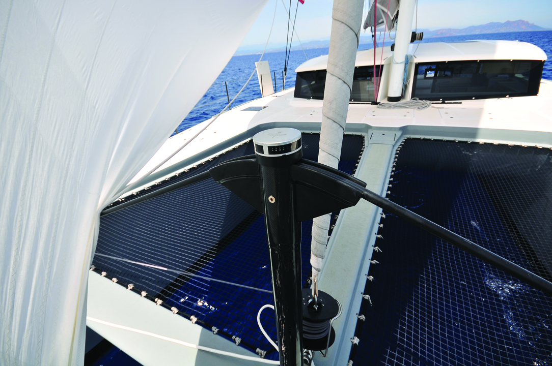 François Pérus, now one of the pillars at Yacht Design Collective, is a graduate of the Christophe Barreau school, one of the world leaders in catamaran design for some years now; this is clearly visible in the fundamentals - the general finesse of the lines, the maniacal attention to the weight specifications, and the stiffness of the chassis. The young architect has implemented the 14.99 project in compliance with the specifications set by Itacatamarans, while coming up with an authentic and attractive design. The overall lines have strength, the straightness of the topsides is delicately sculpted, a light shear gives movement to the deck edge, bows and sugarscoops are finely connected. A high platform and wide-open tunnel contribute, with the sleek sail plan, to the perception of a luxury sport catamaran. The colored gelcoat is a good idea: maintenance will be less demanding than for a painted or wrapped finish. The coachroof – with its large vertical glazed surfaces - and the bimini, with its deliberate, almost cubist design, remain elegant despite the boat’s impressive living space. The mast, by Lorima, the carbon chainplates embedded in the topsides, the carbon fiber cross (compression beam and front beam), the monopod cathedral-stay support and the fiber martingale reveal the obsession for quality.