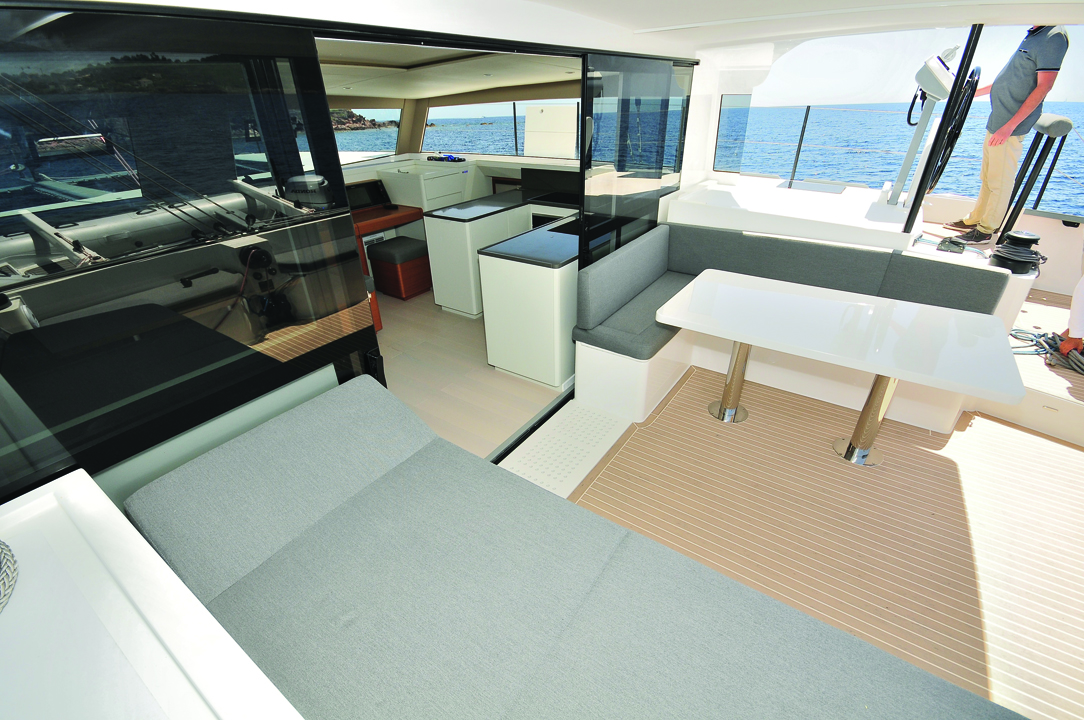 Before we cast off, I had the architecture of the Ocean Volt electric propulsion system explained in detail (two 15kWA/48V saildrives, a 15kWA Fisher Panda generator and a 16.5kW lithium battery bank). The installation is very careful done, in particular the sound insulation and anti-vibration of the engine compartments. As we left the dock, the available torque was obviously considerable, right from the first revolutions of the propellers, which facilitates extracting yourself from tight spaces in a marina. The control with the superb brushed aluminum throttles is precise. The three-bladed folding Gori propellers (reversible for hydro-generation) have excellent efficiency and we theoretically have a ½ hour range before the generator (automatically) fires up. For the purposes of our test, we intentionally used the entire available reserve, and the generator kicked in at the said time - with such discretion that we had to check using the on-board computer. We made headway towards the Rade d’Agay at 7 knots in around 10 knots of southeasterly breeze. The maximum speed stabilized at around 7.9 knots. To fully understand this boat, let's accept the starting equation: it's a real sailboat, not a motorsailer. The ITA moves under sail from 5 knots of wind; 10 knots is enough to recharge its entire battery capacity by hydro-generation in a few hours. The generator is therefore reduced to a secondary role: that of supplying power to the air conditioning at anchor (rarely required), heating (possibly depending on the sailing area and the season) or the motors if the use exceeds the planned range, which is largely sufficient for typical anchoring and docking maneuvers. After taking a few shots in the perfect setting of Agay, we headed straight out for the open sea under solent and main to take some dynamic videos - which allowed me to see the excellent choice of fast tender and the operation of the davit system when going into the open sea with a big chop. The One Sails membrane sails are a good match for this catamaran; the solent on its furler (all or nothing) is equipped with soft shackles, a great idea that eliminates the weight and windage of the furling system. The solent gets replaced by a staysail for sailing in very strong winds. The generous sail area (91m²/980 sq ft) of the main contributes to the consistency of this choice of sail plan. A code 0 and a code D - furlable asymmetrical spinnaker - skillfully completes the light airs strategy. It’s surprising to feel the boat's agility under main/solent in just 10 knots of wind; however, we hoisted the gennaker to sail offshore in search of the afternoon’s south-westerly breeze. Unfortunately, this can be capricious... but the conditions are ideal to highlight the qualities of the ITA in light airs. The steering is precise and the feeling of the appendages is very pleasant and direct: self-aligning bearings, Jefa articulated steering column, rigid transmission and Carbonautica composite tiller... a must! This multihull is alive all the time, and I even noted a peak - which went unnoticed - at 10.3 knots with a wind that rarely exceeded 9/10 knots true, and our average speed varied between 7 and 8 knots on a fairly rough stretch of water. Remarkable performance! The hulls pass very delicately through the water, the bows lift quickly in the water for more than a meter while the wakes remain very soft. This medium-sized catamaran has the particularity of featuring very flattened U-shaped hull sections and little rocker, which favors the high speeds promised by the VPPs (22 knots at 115° in 25 knots true and a weight of 12.5 t). Amazing performances for typical fast cruising hulls of only 15 m (50’) in length.