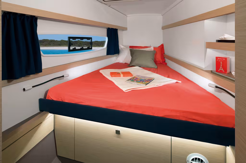 It's on the owner's version that you really see the volumes, but first you notice the quality of the fittings, the woodwork (in light oak Alpi) and the creative design: remarkable for a model of this size. Separating the toilets and the bathrooms increases the level of comfort perceived. Guests are no longer less well-treated: the forward and aft cabins to port offering the same a level of comfort with separate, private showers and toilets. Ventilation and light are worthy of a charter of model (top of the range bedding is standard).