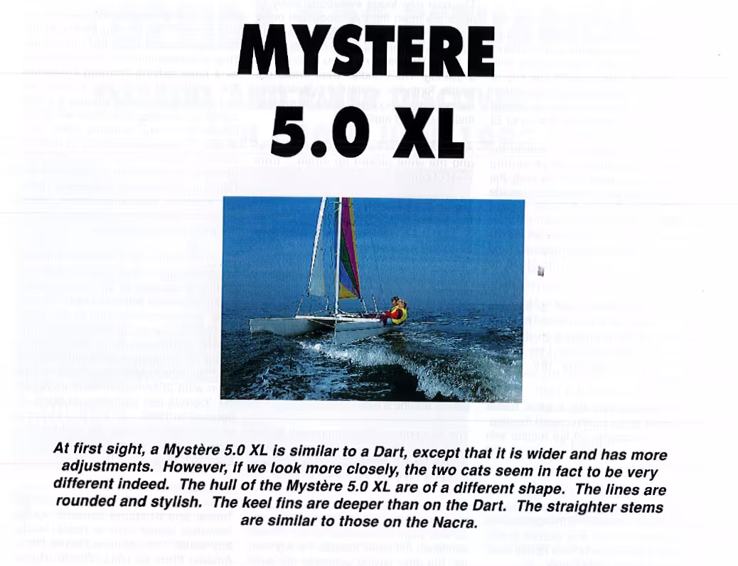 At first sight, a Mystère 5.0 XL is similar to a Dart, except that it is wider and has more adjustments. However, if we look more closely, the two cats seem in fact to be very different indeed. The hull of the Mystère 5.0 XL are of a different shape. The lines are rounded and stylish. The keel fins are deeper than on the Dart. The straighter stems are similar to those on the Nacra.