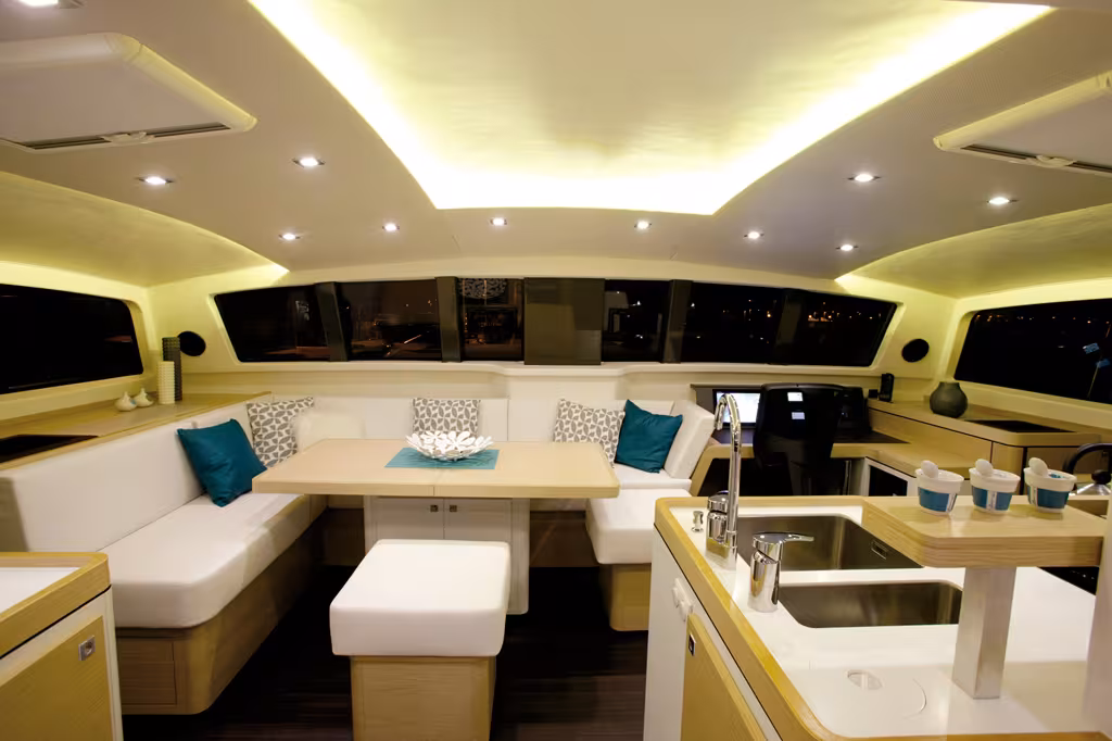 The 51, like its predecessor, is constructed out of poly-vinylester infusion, with the bottom of the hulls rightly constructed in one solid piece, so that the boat can take the ground. Thanks to the skegs protecting the saildrive legs and the rudder blades, the boat can be carefully beached. The yard can also build a foam/carbon sandwich structural bulkheads option, of which the stiffness and reduction in weight enhance the increase in power generated by the carbon mast and square top mainsail.