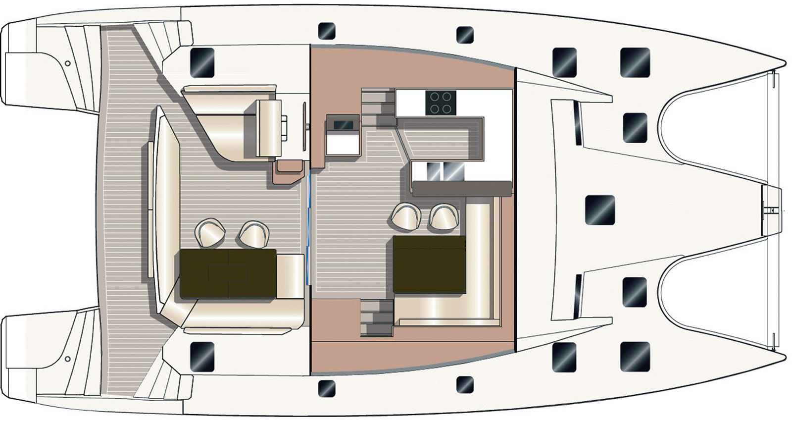 The galley has larger worktops, and all the appliances are better integrated. The unique feature of all Privilège designs is the central rostrum, which stiffens the platform as a whole as well as the forestay chainplate and attachment points for the genoa and staysail.