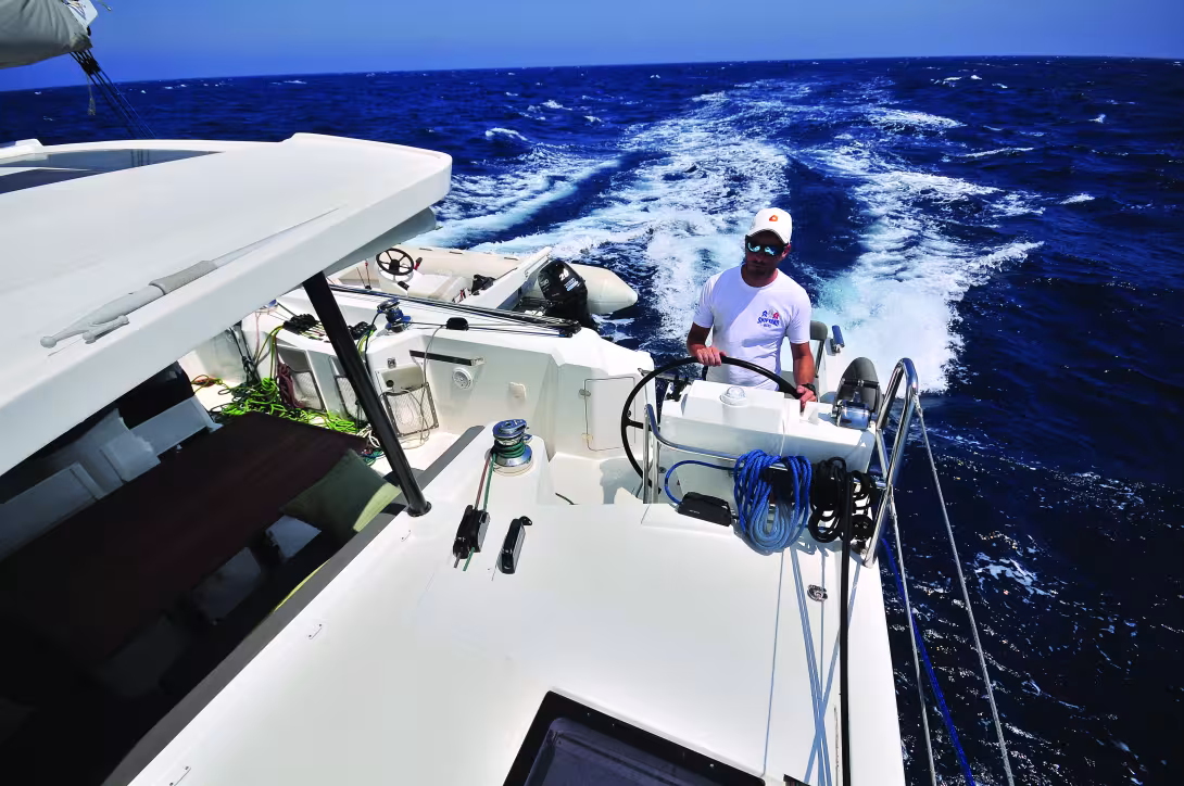 Our test Slyder is rigged with a fixed aluminum mast with two sets of spreaders and quality membrane sails. The catamaran has been well set-up by BMS in Canet-en-Roussillon and immediately shows an obvious maturity. The engine drive is perfect (beautiful installation and soundproofing), all the hardware works wonderfully. The 90 m² (970 sq ft) mainsail is hoisted with one reef as the wind is irregular out of the NW, blowing between 18 and 28 knots. With the solent unfurled, the catamaran immediately takes on her cruising speed while reaching in a short, choppy sea. I know these waters well and am in admiration of the Slyder's behavior in these conditions. The course-keeping and the comfort felt are surprising, the speed (always over 10 knots) and the trim of the catamaran astound me. The course stability is perfect. In spite of her beautiful power, the 49 remains very tolerant and reassuring, even under the strongest gusts. The control of the sails highlights a perfectly thought-out and realized deck plan: everything is oriented towards simple and readable ergonomics. The position of the mainsail clutches in the aft beam, the orientation of the excellent Andersen electric winches, the exacting choice of each line diameter, and the quality of the sailing maneuvers show a concern for perfection that I really appreciate. We hesitated to hoist the gennaker in these conditions, and our top figure of 13.3 knots remains well below the real potential of this catamaran. For me, the strong points that emerge from the test are the ease with which she goes through a sea, the smoothness of movement and the high average speed. Thanks to the magnificent Jefa rigid steering transmission and the quality appendages (curved daggerboards and rudders), the helm control is perfect.