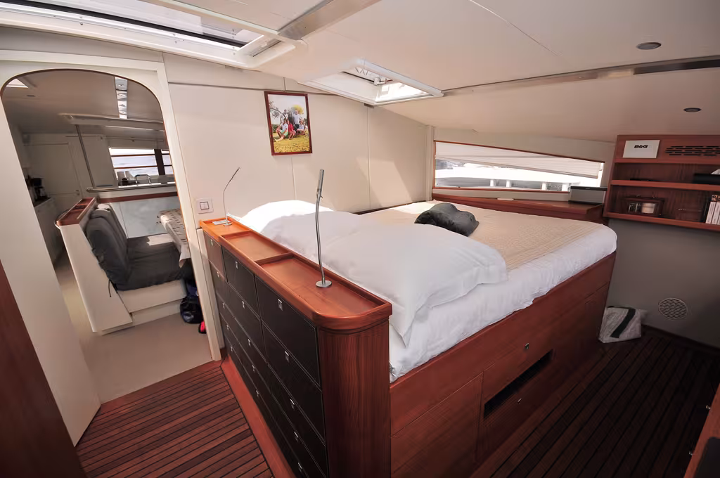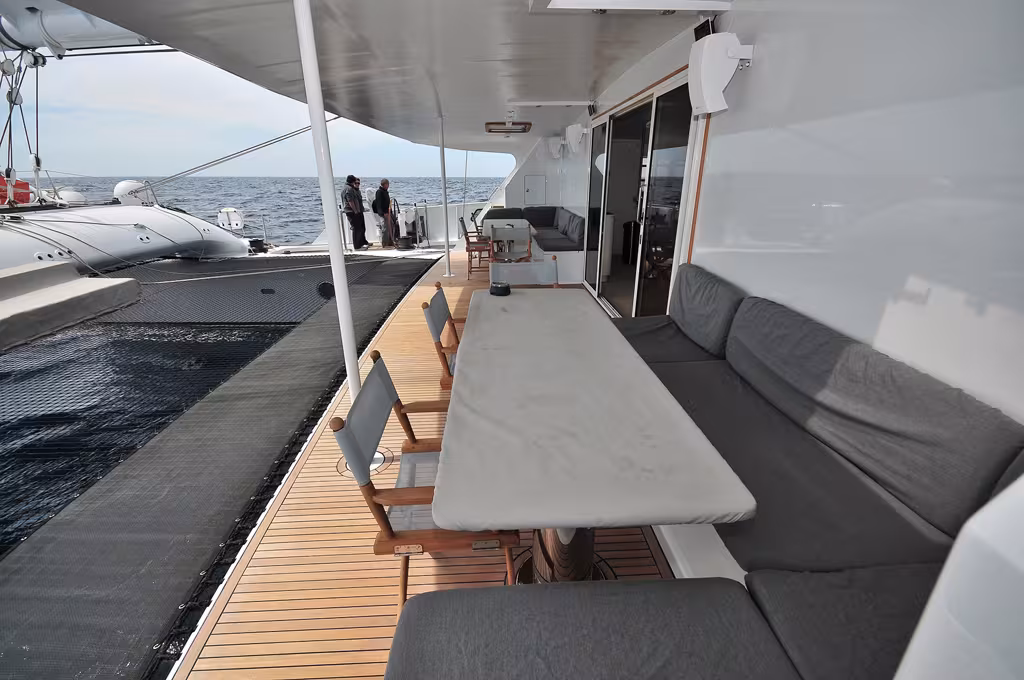 The interior layout of Vitalia is dictated by the original structure. However, I found a rare feeling of comfort on this boat! The minimalist atmosphere of the cabins is well designed and completely functional: the contrasting mix between the cozy alcoves and the carbon giant is without doubt the key to extraordinary sailing which will also serve as a means of transport. Star Wars fans might try and imagine their own private space on the Millennium Falcon! The six cabins and the two crew areas are assigned subject to your function on board. The twin cabins offer a remarkable level of privacy. The nacelle (air-conditioned) is a really neat bit of architecture which combines the owner’s suite and a formidable dining area which can seat a dozen friends next to an XXL-sized bar and the chef’s galley. The panoramic view is amazing, with the view forward overlooking the sail-handling cockpit and some of the world’s largest carbon winches. In the center is the incredible 45 meter high rotating mast. Beyond that, it’s a further 20 meters to the bows. Aft, you have the most exclusive lounge-terrace on the planet. You’ve got the best seats in the house, and the orchestra of only five musicians is going to play to you as if you were at Carnegie Hall or the Royal Albert Hall listening to a philharmonic orchestra. Conjure up either listening to Mozart or Mark Knopfler, at 25 knots adjust the salon’s (hydraulic) bench seat, and enjoy an amazing spectacle with which no theme park in the world or any 3D film could compete!