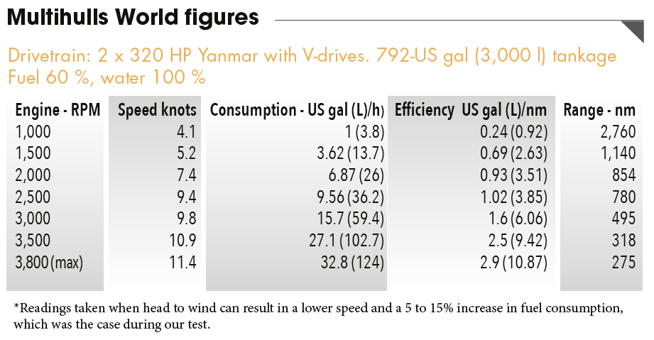 The hull and superstructure in foam/polyester sandwich inspires confidence: the absence of vibration on impact with the waves appears to confirm this boat’s aptitude for some serious passage-making. Given a laden displacement of 30 tons, we are more in the realms of a trawler yacht than a fast powercat. The initial specifications correspond more to embarking on a possible transatlantic passage than to breaking speed records. Our test catamaran was equipped with the “small” drivetrain featuring a pair of 320 HP motors, mounted using a V-drive with four-blade propellers – though these deserve to be slightly larger in diameter. In 15 to 20 knots of wind and a moderate sea, we cruised between 9 and 10 knots. The maximum speed was 12 knots, but in good conditions you can expect two knots more. The soundproofing level of the engine compartments is undoubtedly a point to improve, to bring it up the general level. For a little extra speed, Yanmar engines with 440 HP are offered, but what’s the point? Gaining two or three knots isn’t a drastic game-changer, and in any case, what users want is to be able to live quietly on board rather than having to suffer the untimely lurching about that can be associated with speeds of fifteen knots or more. The interior helm makes for a very comfortable navigating station, whether standing or sitting, for keeping watch on long passages without being separated from the rest of the crew. From up on the flybridge, the view on the water is simply regal. Running in excess of 9 knots, fuel consumption is just over 13 US gallons (50 liters) per hour, but by easing back to 6.5 knots, 3.7 US gallons (14 liters) are enough to satisfy the Yanmars’ appetite. Note that the upwind conditions for our test were less than ideal. The shipyard can install an optional tank that gives an additional 264 US gallons (1,000 liters), bringing the fuel capacity to 1,056 US gallons (4,000 liters). Long crossings therefore become possible, with a range of over 2,000 nautical miles.