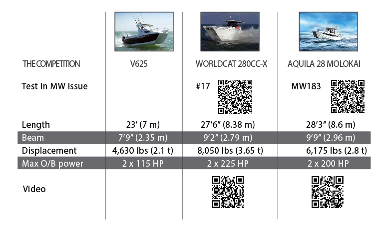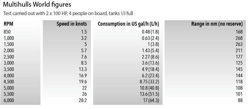 We can’t stress this often enough: twin engines set wide apart make for easy maneuvering. By putting the throttles in opposite directions, the Cheetah pivots on the spot and getting out of the maze of pontoons at the boat show is actually good fun. In the harbor channel, we were greeted by a moderate sea breeze kicking up a small chop. Speed was understandably limited to 5 knots until we cleared the last pair of green and red buoys, and then our test really began! In the absence of a trendy hull design, the Cheetah 720 is relying on the wisdom of its builder in terms of seakeeping performance. And there’s no doubting the experience of the team that designs these powercats for the most demanding uses. No muffled comfort, but supple and quickly damped movements. When faced with a sea, a certain amount of spray (due to the lack of deflectors and/or sufficiently effective chines) invited itself on board. We were perfectly protected in the open wheelhouse - less so aft in the cockpit. The water-repellent glazing allows us to do without windshield wipers. Our test boat has the most powerful engine option with 2 x 100 HP, though the builder also offers either twin 80 HP or 90 HP. The range is therefore relatively tight on a scale that has nothing to do with the powers typically found in the US. In fact, the performances are rather prudent. The maximum speed with the twin 80 HP setup is about 20 knots, or 24 with 2 x 90 HP, while we reached 28.2 knots with our 2 x 100 HP. As for acceleration, it took us 7.81 seconds to reach 20 knots (planing at 11 knots at 2,800 rpm). Compare these figures with those of the Aquila 28 Molokai - 0 to 20 knots in 3.8 s and 40.8 knots of max speed - and the WorldCat 280CC-X - 0 to 20 knots in 5 s and 43 knots of max speed. Note that when we tested those two powercats, they were equipped with twin 200 HP motors - and have slightly longer hulls. Logically, the Cheetah’s fuel consumption is reasonable, as it manages to burn 1.4 liters (just over a third of a US gallon) of fuel per mile at almost 17 knots. On the other hand, the two 26-gallon tanks supplied (2 x 100 l) don’t allow for much in the way of long-haul work, with a range of less than 200 miles if you’re doing more than 6 knots.