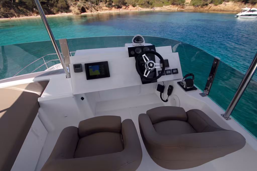 The MY 37 is higher off the water (average freeboard of 91cm) than her competitors, but more importantly, is narrower: 5.10 meters, as opposed to the 6.79 meters of the Lagoon 40 MY which is only just longer. A few dozen centimeters which can reduce your marina charges… and gives neat aesthetics, enhanced by the color scheme: white for the lower hull, bronze for the topsides, a black reveal containing the hatches, and then another bronze layer for the coachroof overhang. All this gives an elegant and modern look to the MY 37, which, as the smallest in Fountaine Pajot’s motor yacht range, is seen as an entry-level boat. Daniel Andrieu’s design team has opted for fine-entry bows which then step out, forward above the waterline, to become a step which continues around each hull. This immediately gives a reduction in wetted area to reduce the wake - and therefore the amount of energy required for propulsion - but is equally effective as a spray deflector. Even though the need for an anti-leeway design is nothing like as important as with a sailing catamaran, the architect has nevertheless drawn the 37 with stubby keels - giving a draft of only 80cm - so as to maintain a bit of grip when maneuvering slowly at close quarters with the wind on the beam. This is important, because the MY has fairly significant windage, especially with the hard-top. And the motors are not so far apart… so perhaps the bow thruster option designed by the yard might not be such a bad idea in the busiest of marinas. The helmsman, up on the flybridge, enjoys an excellent view generally, but can’t see the four corners of the boat. A crewmember on the deck would be handy.