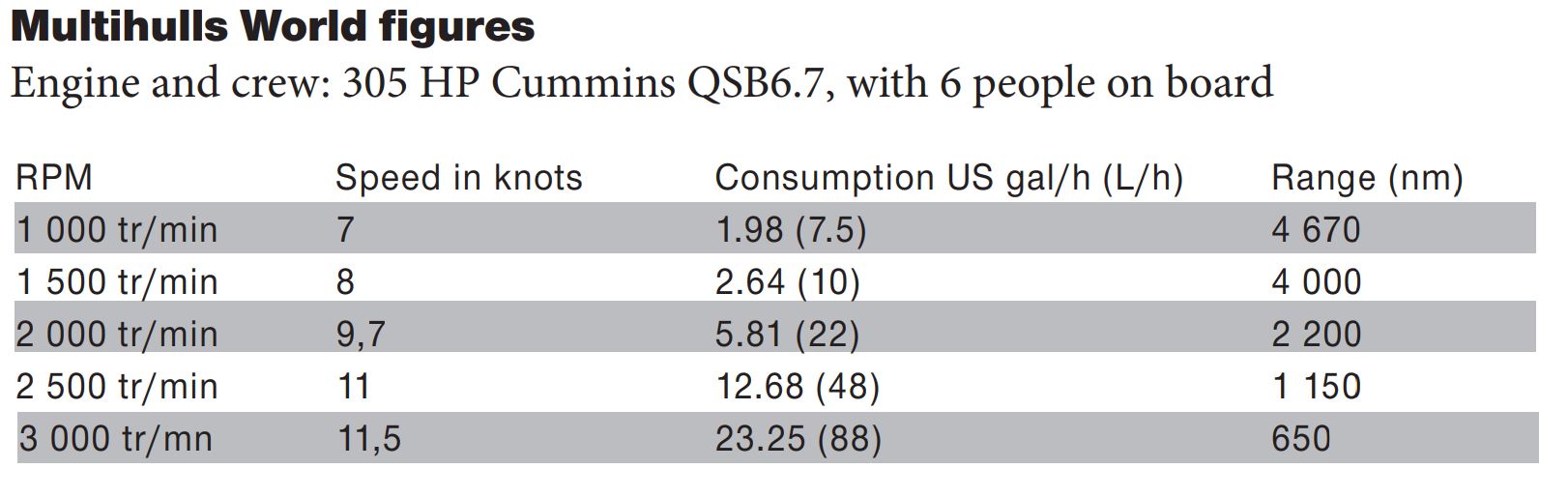 Eric Bruneel is at the helm. In front of him, an imposing dashboard. To his right, direct access to the side-deck via a sliding door. A central staircase leads to the forecabin, but moving aft, having passed a heads compartment, I find myself in the most incredible engine room. XXLsized batteries first, then an imposing 305 HP Cummins QSB6.7 motor: another professional choice. The soundproofing has been particularly carefully installed: 2” (50 mm) of heavy insulation and an anti-vibration paint. Beneath our feet, four separate tanks - totaling 1,320 US gallons (5,000 liters) - to prevent any fuel contamination. Port maneuvering is facilitated by the two 15 kW electric motors placed in the floats - a bow thruster is quite unnecessary. The large power bank (22 kWh in 48 V lithium-ion Mastervolt batteries and a 24 V buffer bank) as part of the “Hybrid Pack” allows you to motor for an hour at 4 to 5 knots without using the main engine. Beyond that, the generator would take over to maintain this reduced speed. Not that there would be much point, given the generator consumes 1.3 US gal (5 l)/h - the main engine will do as well if not better at such low speeds. The general principle is rather for “clean” boating in areas where it is required (or desirable), and thereafter to run the Cummins between 1,800 and 2,000 rpm. The ideal boatspeed is 9 knots, with a consumption of 4.75 US gal (18 liters)/hour, or half a gallon (2 liters) per nautical mile. A quick calculation of the range with the 1,320-gallon/5,000-liter tanks: 2,500 nm! By easing off the throttle a little to 7/8 knots, you can exceed 4,000 nm. Compared to powercats of the same size, the consumption of the LEEN 56 is twice as low. By cutting out one engine, a twin-hulled machine could nevertheless be back in the game.... On the other hand, as we mentioned previously, most of these powercats are doing 24 knots, with the throttles hard down. Nothing like that with the LEEN 56: 11½ knots is its maximum speed. A modest figure that translates into a consumption of 23 US gal (88 l)/h, compared to 5.8 US gal (22 l) at 9.7 knots...