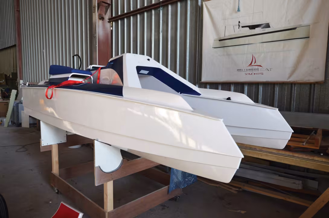 This young and friendly team is based in the same hangar is home to Switch catamarans, at Balaruc-lesBains. The dynamic and bustling atmosphere smells like a start-up. Vincent, an oceanographer and biologist by trade, has solid experience with the projects he set up and piloted in different parts of the Planet before becoming the “innovation” director of the LanguedocRoussillon Region of France. “When I saw the America’s Cup AC 72s sailing on San Francisco Bay, it clicked instantly,” he admits. In the workshop, my eye is immediately drawn to a model of the Overboat that sits in the middle of various workstations dedicated to the manufacture of engines, foils and electronic systems - the hull being subcontracted to a specialized composite workshop.