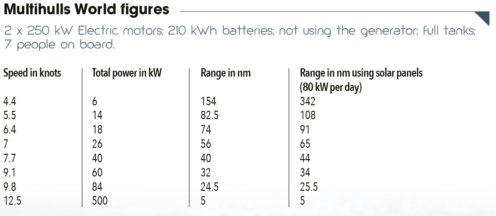 As in the automobile industry, boats that use electric propulsion have evolved considerably. A successful concept and accepted technological choices: we have come a long way since the utopian projects of (only) 10 or 15 years ago. A notable difference between electric cars and electric boats is that the former do not use solar energy - one might wonder why - whereas on the sea they do! Of course, it is the multihull configuration that is the most important factor, combining large deck areas and low drag. Today, the Silent 60 demonstrates that it is possible to enjoy comfortable cruising without using fossil fuels. But the “official” speeds are still quite modest... mostly because of the displacement. The Silent 60, built in glass/vinylester composite, is close to 29 tons lightship displacement. This is very heavy compared to the 11.5 tons of the all-carbon Class 6 Power. The next step will undoubtedly be to reduce the weight!