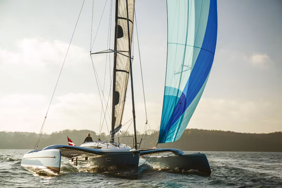 As soon as we leave the marina built especially for the International Multihull Show, we unfold our starboard float in a few seconds - the trimaran was moored in proa-mode during the show. The architect of the 32 Evolution, Jens Quorning, adjusts the runners for the medium-high winds that await us outside. At the helm, I am delighted to be back on a platform that I enjoyed in the Baltic in 2012. The engine purrs without vibration or chassis noise; this small diesel with its reassuring power perfectly handles in-port maneuvers (with the precious help of the bow thruster) which are of short duration with this machine. A sunny Tramontane (12-20 knots out of the NW in the western basin of the French Mediterranean) is blowing across the large bay of Aigues Mortes, our test track for the day. Jens has prepared the code 0, by Elvström Denmark. Under full main, we start out on a starboard tack towards Sète, to our SW. The boat is already making progress, and hoisting the code sail - taking care to bear away generously before heading up again - gives us the power we expect and the white cavalcade begins. The pivoting Jefa helm is a real pleasure – I’m not sure it’s indispensable, that’s a matter of personal taste and budget compared to the excellent tiller. I'm already on my little cloud, skimming along with the wind at between 12 and 18 knots. Only the luff of the code 0 indicates the limit not to be exceeded coming higher upwind, but the maximum power is there. Bearing away in some of the stronger gusts allows you to enjoy the precision of the helm and the feeling of safety offered by the large floats. Beamier, more powerful but also having more canvas, the 32 Evo is not necessarily faster than the previous version in these conditions, but she certainly has a more trendy look, the stretched underwater hulls of the floats, the wave-piercing bows and the increased reserve buoyancy this brings, constitute a real plus for sailing in cross-seas or driving "on the edge". The deck layout has been perfectly thought-out, ultimately a sublime feeling at the helm: anyone who has never steered this type of trimaran in a breeze does not have a complete nautical resume. Decidedly, life begins at 20 Knots! We sailed most of the afternoon, interrupted only by a momentary break of a few minutes. I suspect Eole ordered this for us, so we could better enjoy the restart phase during which we went from 0 to 15 knots in a just few minutes. The joy of surfing on an almost flat sea under the caress of a steady breeze is untranslatable, the spray that rises from the inverted bow is in harmony with my personal pleasure; I would gladly swap weeks of ordinary cruising for a few hours of fun like this. The chassis of the 32 Evo is perfectly adjusted, no binding noise, no parasitic squeaking or noticeable twisting. After several hours of watersport, we found ourselves well downwind of the bay and came back close-hauled in three tacks. At this rate, the new geometry shows a clear superiority. The trimaran seems very comfortable under full mainsail and solent in an apparent wind that sometimes exceeded 30 knots. The angle to the wind is indecent and there are very few sailboats that can play this game…
