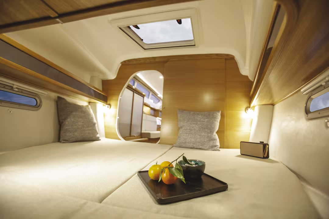 The Dragonfly's almost luxurious interior design is an element of their identity inseparable from their reputation, to the point that it is difficult for the yard to deviate from the chic "blond teak" code to develop the style. The arrival of the 32 Evo offered an ideal opportunity for a change of atmosphere; the varnished elm version is more contemporary and just as well-finished. The volumes in this under-10m (33’) size are very convincing with nearly 2 m (6’6”) headroom under the canopy. The double bed, aft, at 2 m by 1.65 m (6’6”x5’5”), is welcoming despite lower headroom. The sliding companionway stairs are as clever as they are solid. The galley (to starboard, at the foot of the companionway) is well-organized with oven and refrigerator, hob and sink. The chart table is functional, with many peripheral storage spaces. The central saloon, with two large benches facing each other around a generous table with flap, is user-friendly. There’s a lot of light and the impression of confinement has no right to be mentioned on board this boat. Forward, the bathroom with shower and toilet is complete, the double forecabin is comfortable and private. It’s also possible to accommodate a crew member on the port side of the saloon, which can be folded out. The plus of 32: its complete cockpit enclosure kit, which totally transforms the perception of this trimaran in severe weather or just rainy weather by offering a very attractive outdoor lounge.