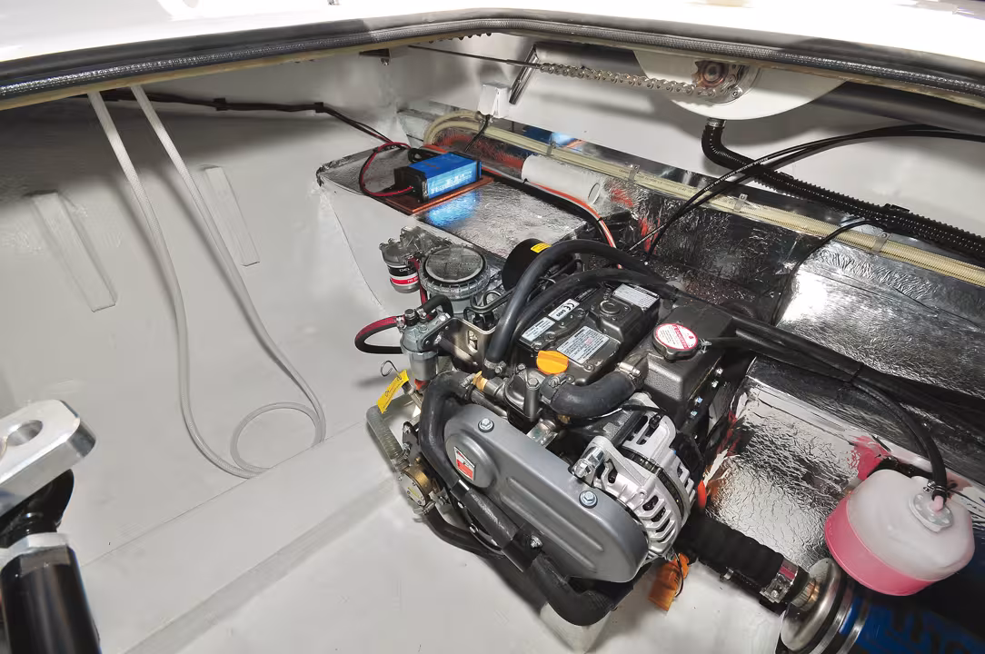 The battery bank is judiciously housed (and secured in protected battery boxes) under the floor of the saloon in a suitable housing, and the connections are serious. The engine compartment - the DF32 is equipped with a diesel inboard engine - is perfectly organized; the 21hp Yanmar on our test boat is advanced as far as possible against the watertight bulkhead. There is room for maintenance and the wheel steering cable transmissions are as usual carefully installed and adjusted. They are secured on a beautifully crafted welded aluminum section and the autopilot is fixed on the rudder arm. A beautiful installation!