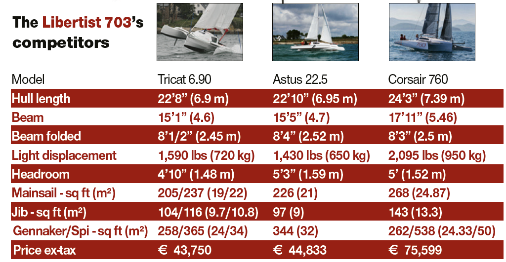 Following the remarkable arrival of the 853 at the International Multihull Show in La Grande Motte in 2019 (test in MW167), it was almost two and a half years before we were able to discover her little sistership, the long-awaited Libertist 703. At the La Rochelle boat show, this time it was the strong personality and the potent look of this small trimaran that caught our eye - the 703 is reminiscent of the great Ocean Fifties, all things considered. With her flush, aerodynamic deck, the central hull even looks somewhat like SVR-Lazartigue, François Gabart’s new Ultim. That’s all it takes for the Multihulls World editorial team to get excited: no, we really couldn’t miss the opportunity to be the first to try this boat... because there are sometimes situations where enthusiasm prevails over reason, passion over patience, the determination of the players over the caution of the boat testers.