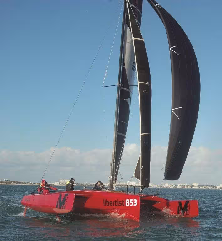 I had carte blanche for the Libertist 853 to improve that eternal compromise between comfort and nautical qualities to which I am so attached. The 28-foot size was chosen to accommodate a nice saloon, a forward cabin, a double berth under the cockpit, a galley, a separate toilet and 1.80 m (6’) headroom, yet remaining transportable when dismantled. The idea of extra mini-foils had been in my head for a long time. The effectiveness of the foils is making progress, but they still had to be sorted out. A fixed solution was required: no risk of dangerous misalignment, manufacturing costs compatible with the selling price and total reliability. It is not about flying, but simply increasing power and safety at high speed by controlling the float's pitch. With a marked dihedral, we also needed to have a rudder under each float for optimum control. The fully infused construction has been well mastered by Rega Yacht, as has keeping the weight under control. Carbon is used where it is really beneficial: arms and appendages. The exploitation of power requires a quality rig and deck hardware, the rotating carbon mast gives a perfect leading edge to a top-of-the-range square-topped mainsail, the weight saving is completed by the use of fiber shrouds. The design is timeless. The tests validated our expectations for the downwind attitude control with the bonus of a reduction in pitch in choppy conditions.