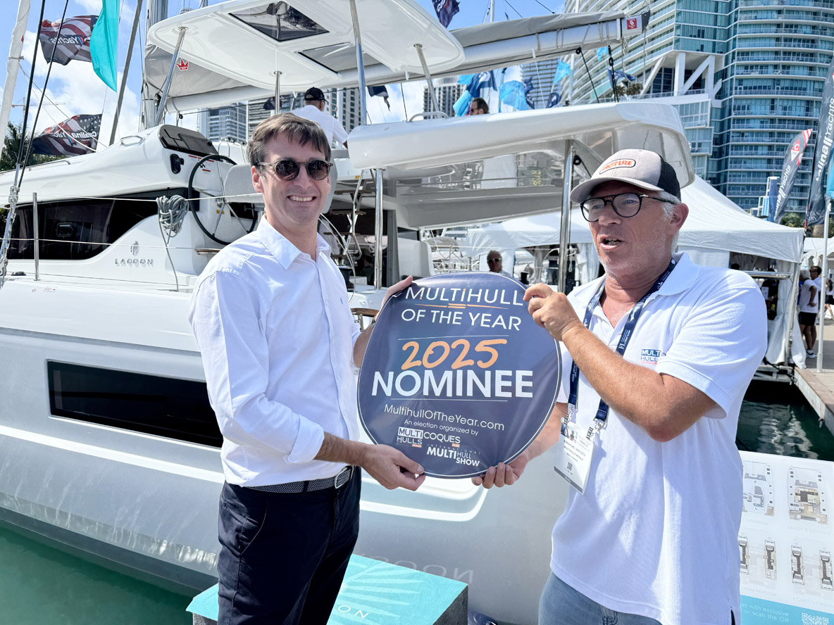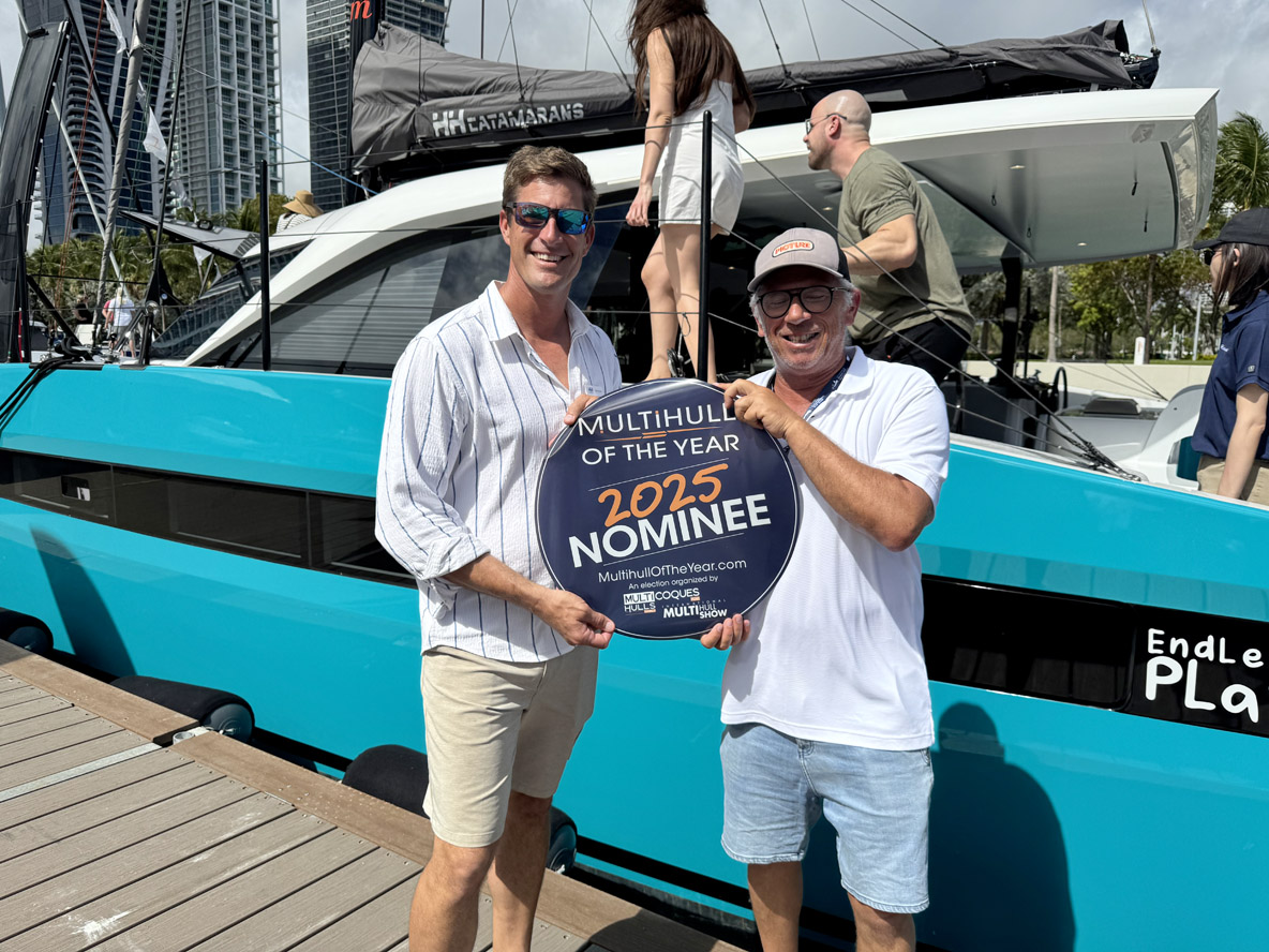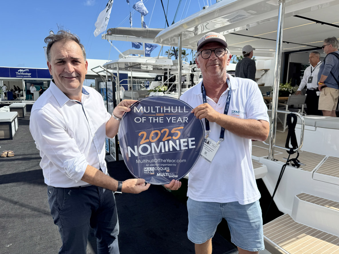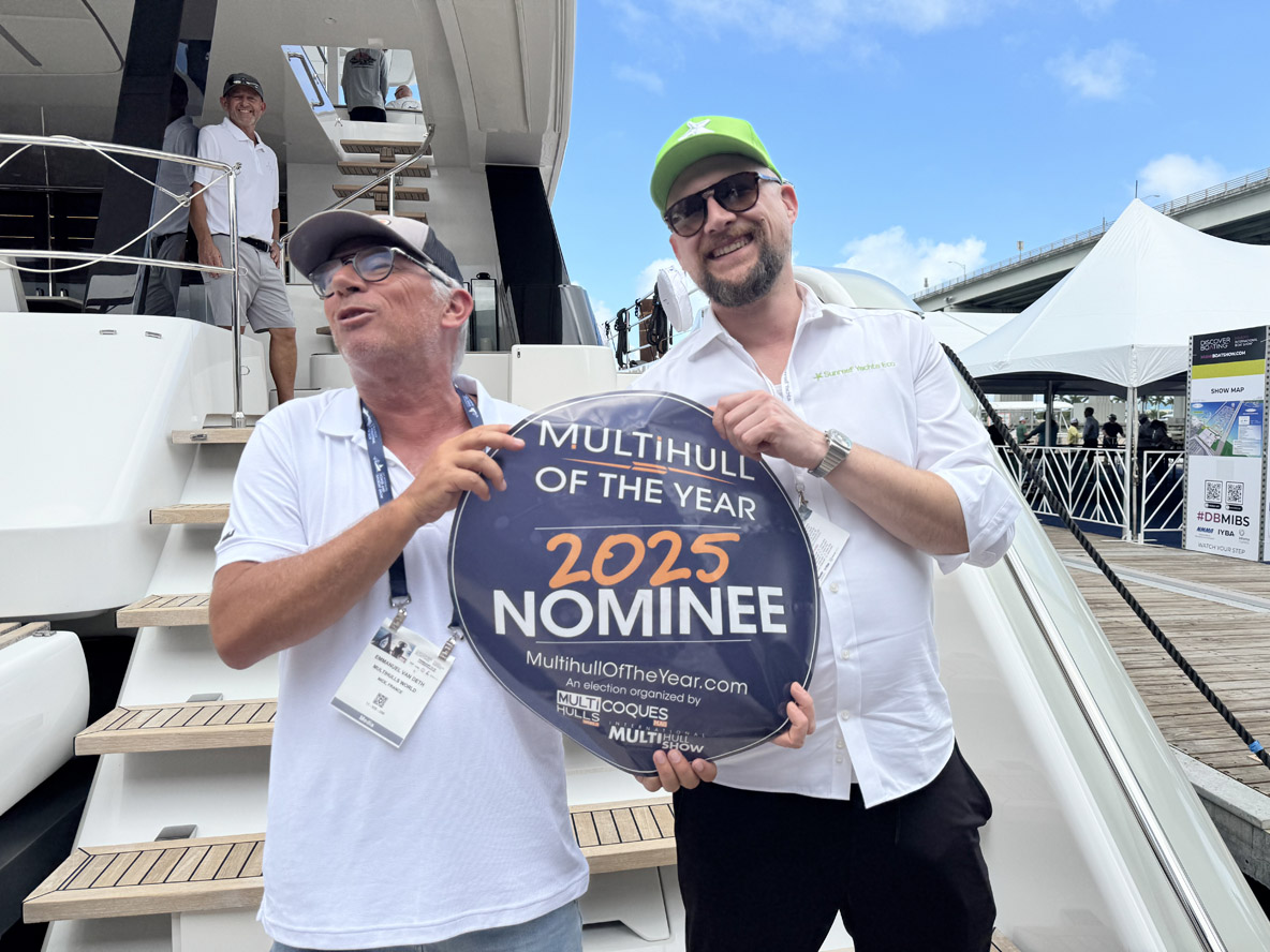 On February 12, opening day of the Miami International Boat Show, we unveiled the list of 25 yachts selected for MOTY 2025. Many of the nominated builders (and their multihulls!) were in attendance at the Miami event, meaning we were able to provide them with stickers and/or banners on the spot!