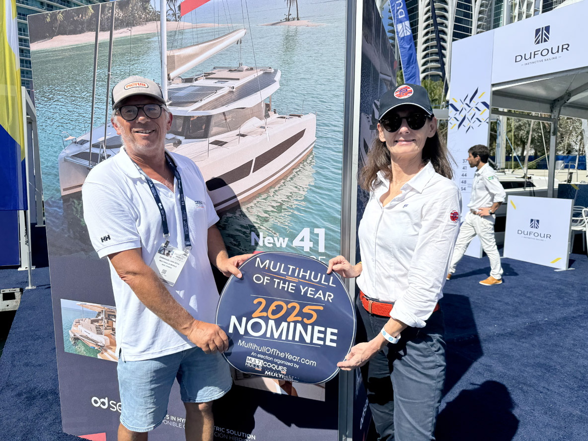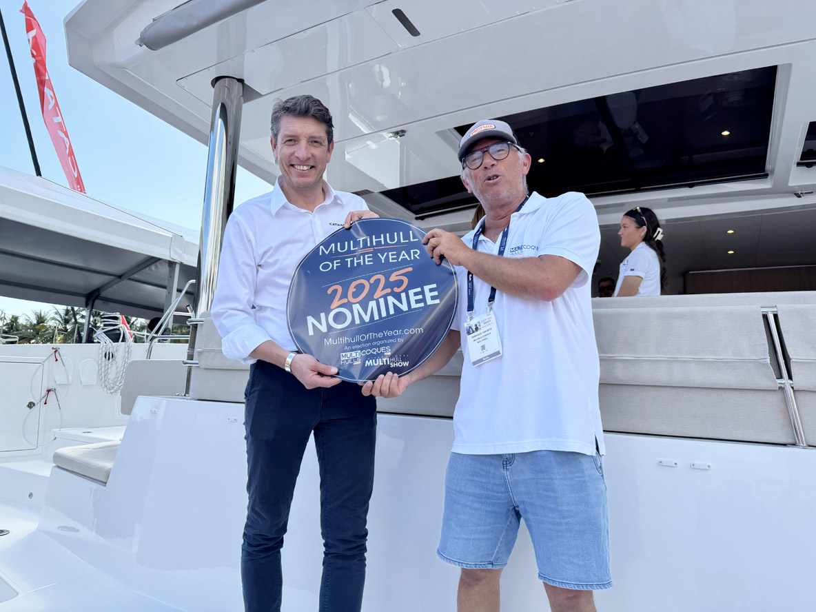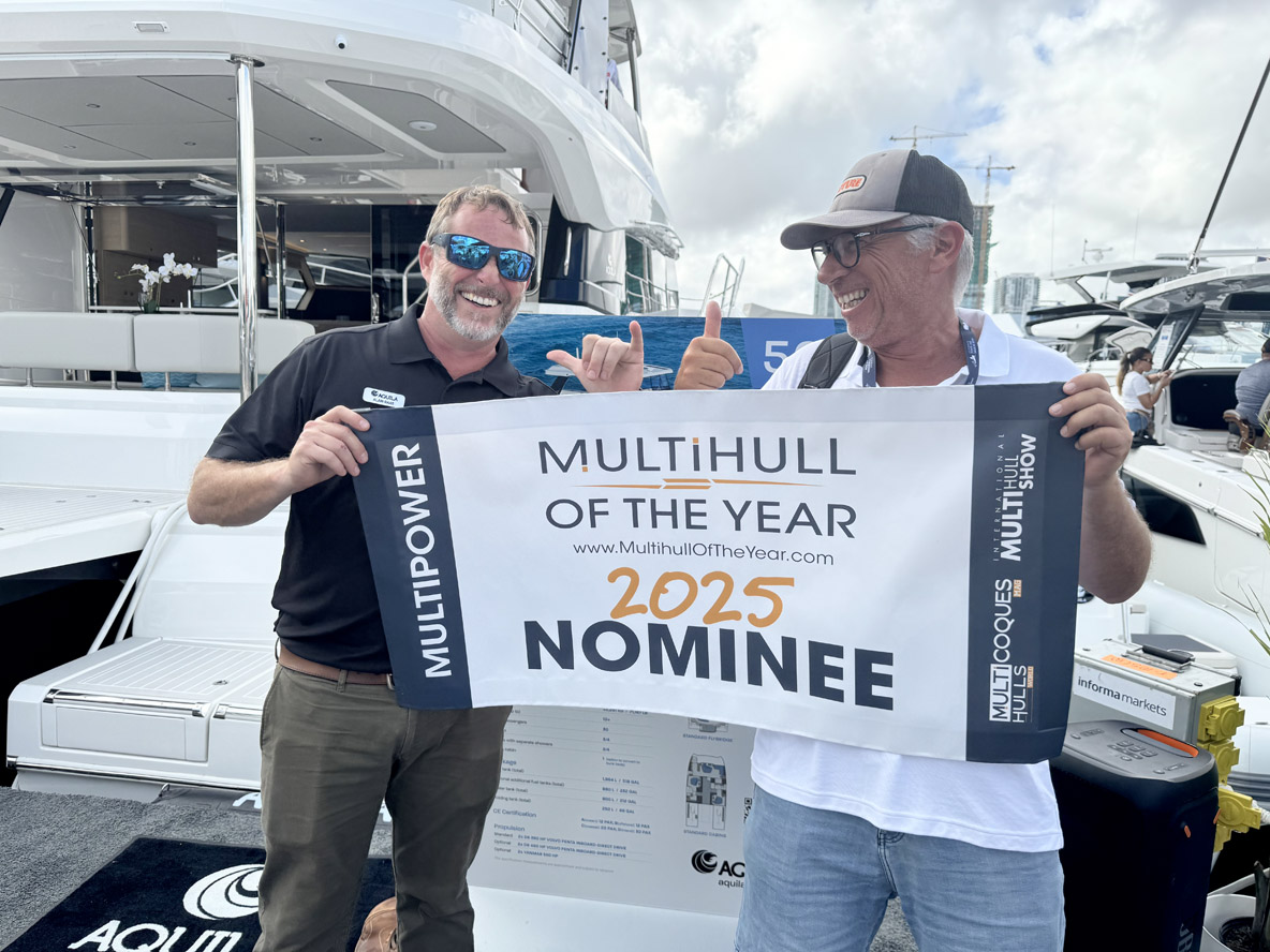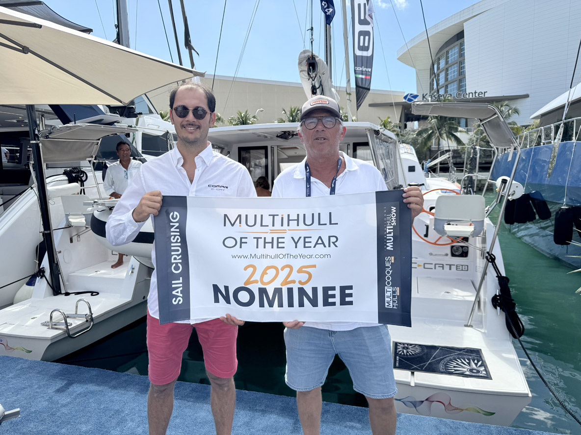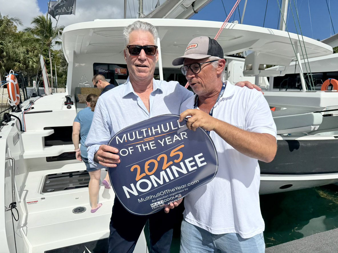 On February 12, opening day of the Miami International Boat Show, we unveiled the list of 25 yachts selected for MOTY 2025. Many of the nominated builders (and their multihulls!) were in attendance at the Miami event, meaning we were able to provide them with stickers and/or banners on the spot!