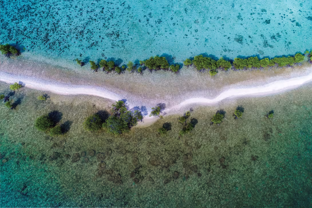 D’un côté, j’aperçois une forêt tantôt verdoyante, tantôt aride et sèche. De l’autre, une eau turquoise, des patates coralliennes qui font office de protection aux tortues et aux poissons, apeurés par les requins en rangs serrés. Au milieu serpente comme un cours d’eau, assombri par la vase des estuaires et la terre des rivières. La zone est infestée de crocodiles aux dents acérées.