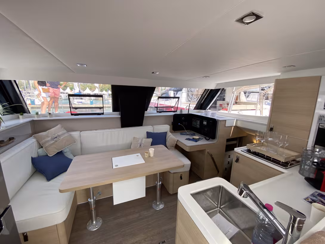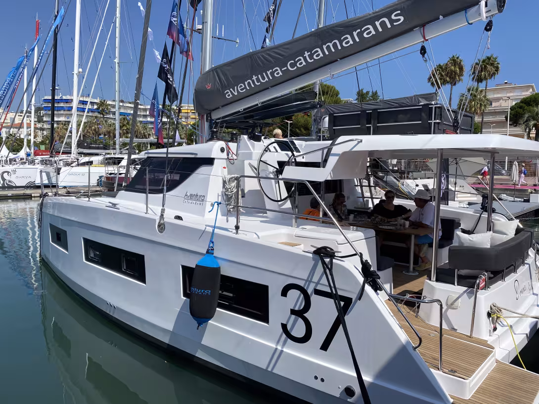 Ce nouveau modèle, dans la gamme Aventura, s’intercale entre le 34 et le 44. Sur le marché, il rejoint de très rares catamarans de croisière de moins de 37 pieds – on retient bien sûr le C-Cat 37 et l’Excess 11. Notre première découverte de l’Aventura 37 est une bonne surprise : si la nacelle est logiquement de surface réduite, le cockpit est vaste. Le poste de barre est reculé pour ne pas gêner les manœuvres – juste devant. Sur le bimini, un solarium est utilisable, mais seulement au port ou au mouillage afin de conserver un beau plan de voilure au près - 95 m2. L’Aventura 37 est disponible en 3 ou 4 cabines.