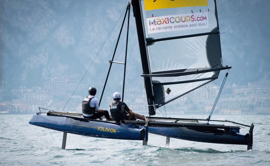 Voilavion est un catamaran de 16 pieds très innovant, dessiné par VPLP et destiné au grand public, et non pas à des marins surentraînés et funambules de naissance !