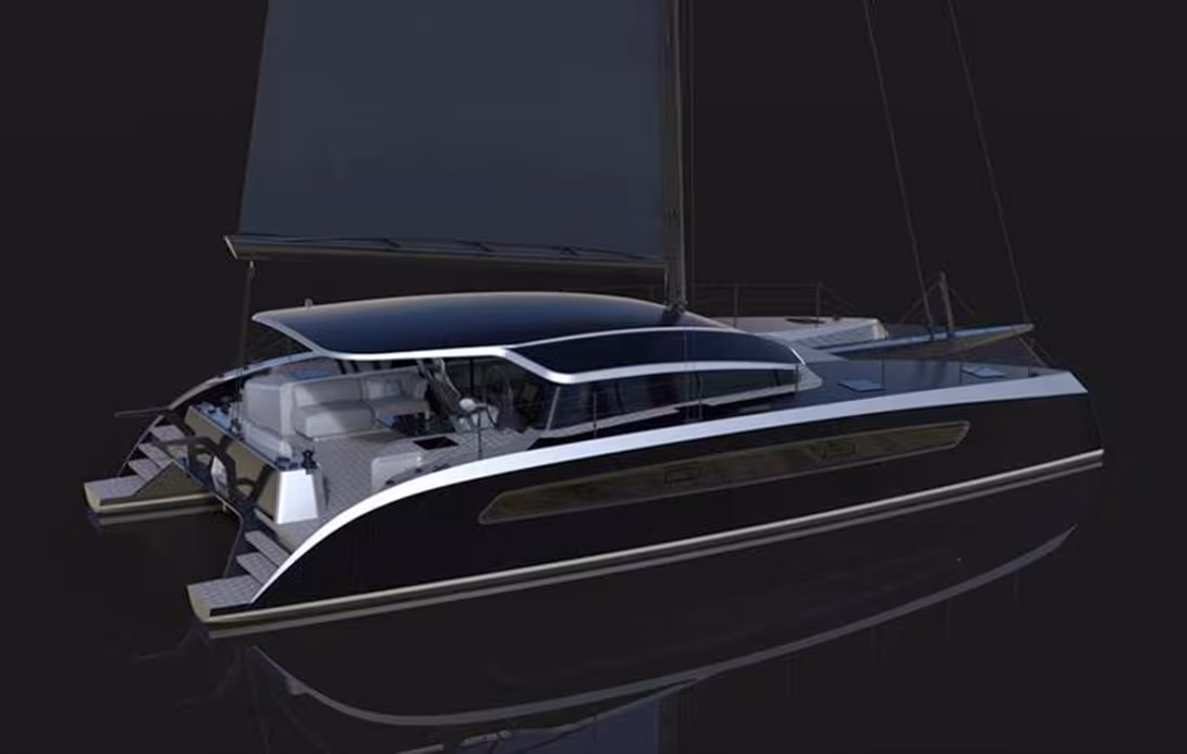 Tous ces catamarans, de couleurs noir et argent, seront construits en carbone/époxy ; la fibre noire a également été retenue pour le mât, la bôme, les postes de barre… même les supports de coupes à champagne seront en carbone ! Ces caractéristiques, associées à un puissant plan de voilure, garantissent d’excellentes performances. Mais c’est du côté des prestations green que se dévoile vraiment l’innovation : pour cette nouvelle gamme, ce sont quelques 100 m2 de panneaux solaires, 62 kWh de batteries en 48V et des moteurs électriques qui seront installés en série. Mieux : des équipements aussi variés que la cuisinière, le moteur de l’annexe et les deux jet skis seront tous, dans un souci de cohérence générale du projet, électriques.