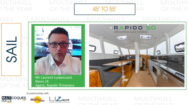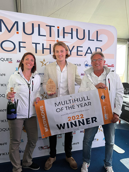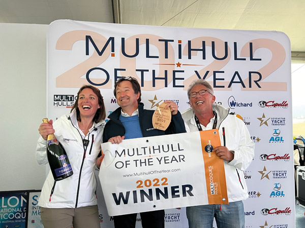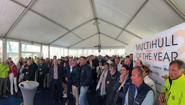 L’événement, présenté par Emmanuel van Deth, notre rédacteur en chef, et Gwen Dorning, notre directrice marketing, a été suivi en temps réel sur les réseaux sociaux, et a bien sûr fait l’objet d’une vidéo postée sur YouTube et les réseaux sociaux le soir même. Les bannières WINNER 2022 ont pu être remises aux représentants des constructeurs : tous étaient présents, excepté l’équipe de Rapido Trimarans. Dès le lendemain, les multicoques primés présents au salon se sont empressés d’arborer leurs cagnards malgré le temps plutôt humide et venté.
