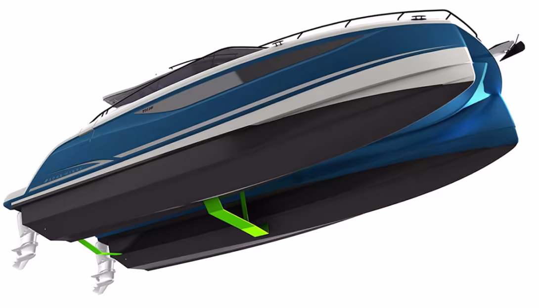 Voilà qui devrait encourager le constructeur à concevoir un deuxième powercat de 40 pieds qui comblerait un peu le vide avec le M48 de Prestige – les deux marques appartiennent au même groupe. En attendant, le TH36 sera prochainement équipé de foils ; cette annonce a été faite lors du boot Düsseldorf à l’occasion de la conférence de presse Bénéteau. Les deux appendices présentés forment des U évasés qui relient les deux coques. Le foil central est renforcé par un support vertical repris sous la nacelle. Cette option permet une baisse de la consommation significative et un comportement plus amorti quand la mer est agitée. La configuration foils a déjà été proposée avec succès sur des modèles de même taille comme l’Aquila 36.
