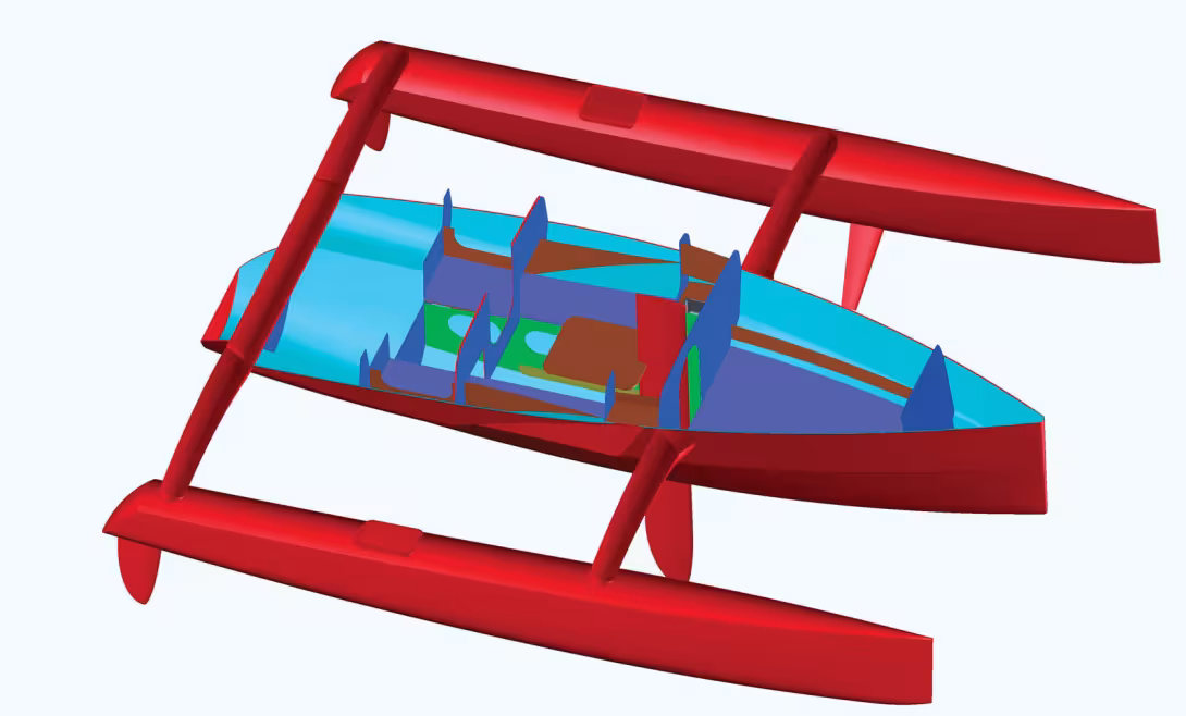 Son petit gabarit a incité le chantier à mette au point un système de repliage rapide afin de faciliter le transport sur route. En plus de la dérive centrale et des deux safrans, chaque flotteur est équipé d’un plan semi-porteur. L’objectif n’est donc pas de voler, mais d’assurer sous le vent une portance vers le haut – plus de puissance et capacité à porter plus de toile. Le redan marqué de la coque centrale concilie finesse des œuvres vives et volume habitable.