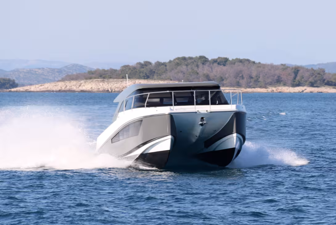 Les premières images que nous a fait parvenir le chantier confirment les promesses des précédents renderings : le design italien d’Emanuele Rossi (ERYD Design) offre à ce powercat Sedan des lignes aussi sportives qu’attrayantes. Le concept catamaran est bien sûr exploité dans le but d’offrir une consommation réduite, une stabilité latérale irréprochable et un confort digne d’un cabin-cruiser à une coque bien plus grand. Le tunnel entre les coques a été étudié afin de créer un coussin d’air amortisseur quand la mer est formée. Le plan de pont prévoit un accès à l’eau (ou sur la plage) à l’étrave (renforcée en Kevlar®) et à la poupe. Les embases moteur sont relevables, ce qui autorise l’échouage en toute sécurité. Ce modèle sera décliné en version Open ou GT. Rendez-vous a d’ores et déjà été pris pour un essai à Split.