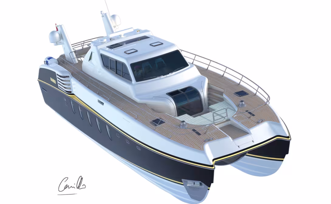 Voici sa vision du catamaran, qu'il qualifie lui même d'Objet Flottant Non Identifié, un concept radical et sûrement peu politiquement correct à son avis, mais qui pourrait séduire des amateurs éclairés, tout comme les concept-cars peuvent le faire… Manbo mesure 23,99 m pour une largeur de 7,99 m, et est motorisé par 2 x 1 400 CV pour arriver à une vitesse de pointe de… 44 nœuds, le tout dans un confort remarquable (et un design "à l'italienne") pour 8 personnes et 4 membres d'équipage.