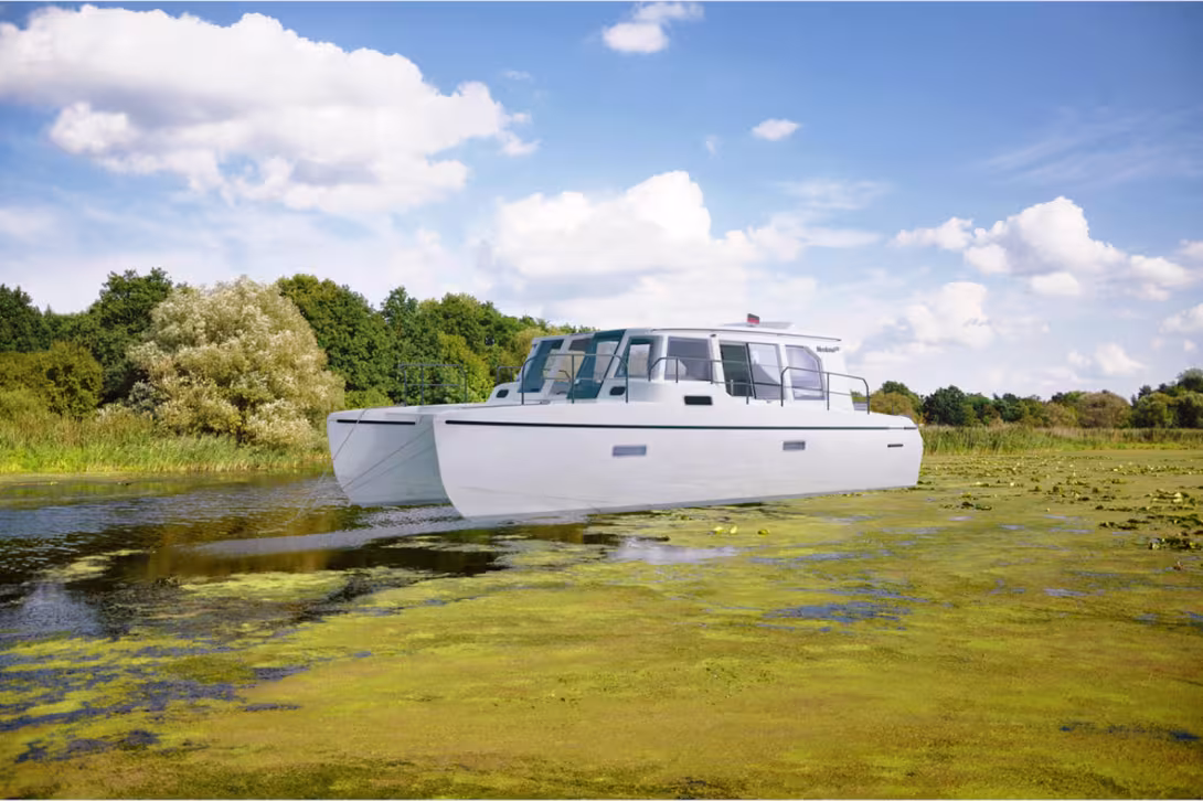 Ce powercat est également suffisamment compact et étroit pour se faufiler partout dans les ports, mais surtout les rivières et canaux. L’échouage est également au programme : non seulement le tirant d’eau est contenu à 45 cm mais les fonds en V des coques permettent de se passer de quillons – et de protéger parfaitement les embases des moteurs hors-bord. La finesse des coques et particulièrement des entrées d’eau garantit un excellent passage dans la mer. En revanche, ne comptez pas sur des lits queen size dans les coques : le Neuland se contente de 22 m2 habitables et privilégie logiquement sa nacelle avec des espaces fonctionnels clairement définis tels qu’une cuisine complète, un grand canapé en U, un bureau et une vaste salle d’eau. Et c’est le carré, convertible en un tournemain en un lit grand format qui vous accueillera pour la nuit. D’autres couchages sont tout de même prévus – ils seront proposés aux enfants. La circulation à bord a été pensée dans les moindres détails avec un passage par l’avant, une porte de coupée à tribord et des pavois ouvrants pour faciliter l’accès au quai. A l’arrière le cockpit se prolonge par une belle plateforme arrière.