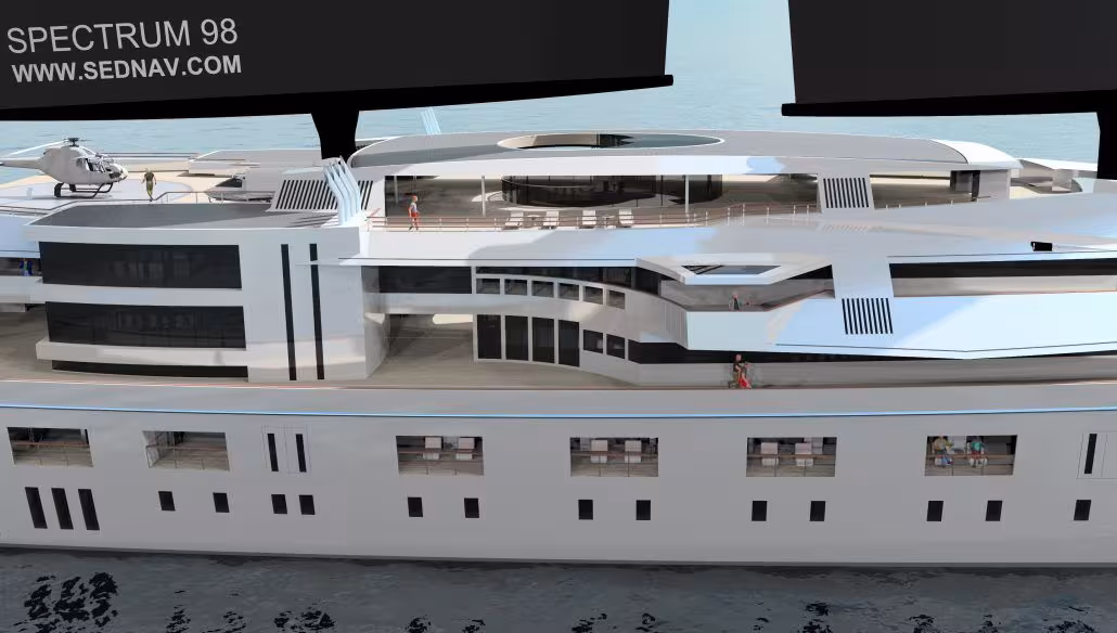 Albert Sedlmayer a préféré poursuivre son projet et espère bien séduire un « vrai » client. Il a donc opté pour une plateforme catamaran avec des étraves à bulbes et un gréement DynaRig avec deux mâts – évolution moderne des anciens gréements à voiles carrées. On compte cinq ponts, pas moins : « un catamaran de taille offre d’incroyables possibilités comme celles de disposer d’un héliport, d’embarquer un hydravion (avec ses ailes repliées) grâce à une grue, d’aménager une grande salle de sport et même d’une chambre d’hôpital », détaille Albert. La sécurité a également été optimisée : Spectrum 98 peut verrouiller ou dissimuler plateformes extérieures, ponts latéraux et escaliers de manière à diminuer les risques d’accès à bord jusqu’à 8 mètres au-dessus de la flottaison.