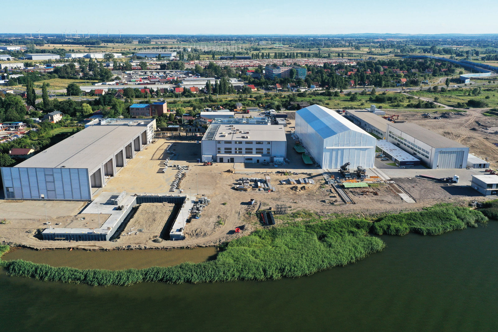 Avec pas moins de 111 voiliers et 33 catamarans à moteur construits, un chiffre d’affaires d’environ 120 millions d’euros et 600 employés – dont 300 en travail indépendant –, Sunreef est aujourd’hui le leader mondial du catamaran de luxe. Huit hangars sont occupés dans les chantiers navals historiques. Ces bâtiments ont reçu le label du patrimoine européen. La zone est en pleine mutation – elle devient un quartier touristique et résidentiel prisé. Les clients qui visitent le chantier passaient une journée à Gdańsk il y a 20 ans. Aujourd’hui, ils restent volontiers quelques jours dans cette ville devenue très attrayante. Les installations conservent un certain charme – le parfum de l’histoire sans doute –, mais sont devenues désuètes face aux impératifs de production actuels, soit 30 catamarans par an et des modèles de plus en plus grands. Sunreef a donc besoin d’un outil de plus moderne. Un tour en voiture nous emmène à deux pas de la ville, sur un bras de la rivière Martwa Wisla.