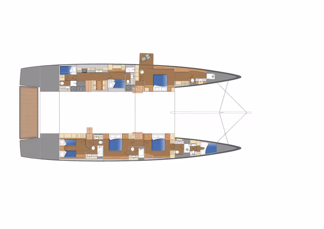 La mise au point des plans prévoit une certaine flexibilité pour les aménagements, mais le cahier des charges de départ est tourné vers des prestations de prestige avec trois cabines hébergeant six membres d’équipage pour huit passagers – répartis dans quatre cabines dignes d’un palace. L’agencement est étudié pour offrir une intimité irréprochable aux invités comme à l’équipage, lequel dispose de son mess entouré de ses deux cabines. Les descentes aux cabines des invités, entièrement custom, sont coudées pour soustraire la vision sur les cabines depuis le grand salon de 45 m² avec vue sur l’horizon à 360°.