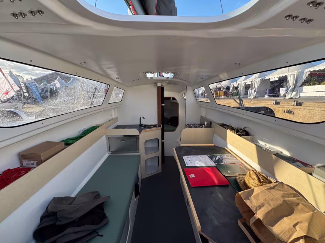 A l’intérieur justement, grâce à deux paires de redans, le 8.50 parvient à offrir une hauteur sous barrot plutôt correcte de 1,82 m. On peut compter sur des vraies couchettes, une cuisine fixe, des toilettes, et de multiples rangements astucieux. Après son séjour à La Grande-Motte, le 850 #1 reviendra en Bretagne ; rendez-vous a bien sûr été pris pour un essai dans le golfe du Morbihan. Cette sortie sera-t-elle aussi ventée que celle du Tricat 6.90 il y a 4 ans ?