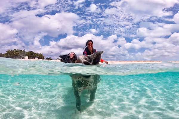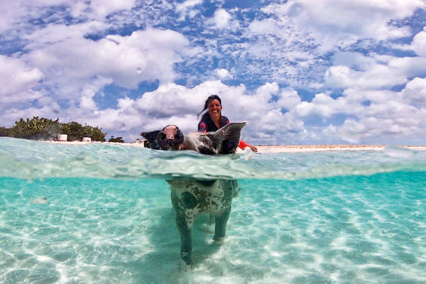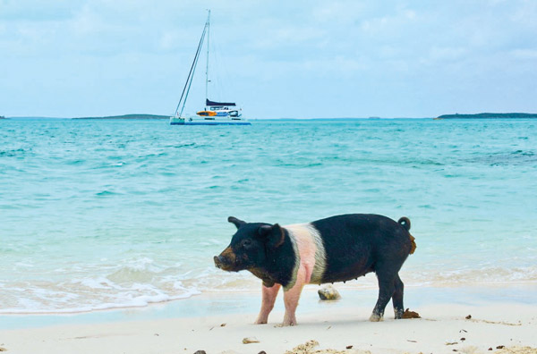 Ils sont depuis quelques années devenus un attrait touristique indéniable aux Bahamas. Personne ne sait vraiment comment ils sont arrivés là. Certains disent qu’ils ont été abandonnés par un groupe de marins qui prévoyaient de revenir les cuisiner, d’autres pensent qu’ils auraient nagé depuis un navire naufragé à proximité. Mais la théorie la plus plausible relate qu’un habitant serait venu élever ses suidés sur une île déserte ! Depuis, il existe plus d’une vingtaine de sites, les cochons étant devenus une attraction incontournable !