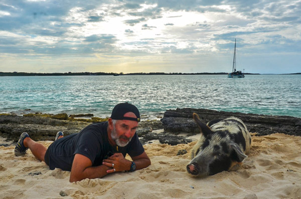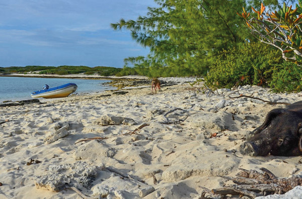 Le passage est étroit. Précautionneusement, nous nous engageons dans le chenal. Nous avons 18 milles à faire pour nous rendre à White Cay. Le point nous a été donné par des amis. Loin de l’affluence touristique, cohabitant avec les bernard-l’ermites, les raies pastenagues et les oiseaux marins vit une communauté pour le moins insolite en ces lieux : une famille porcine ! Oui ! De vrais cochons, pourvus de quatre pattes, un corps trapu, un groin et une queue en tire-bouchon. Et pas n’importe quels cochons, des cochons nageurs !
