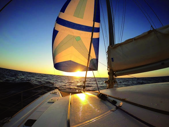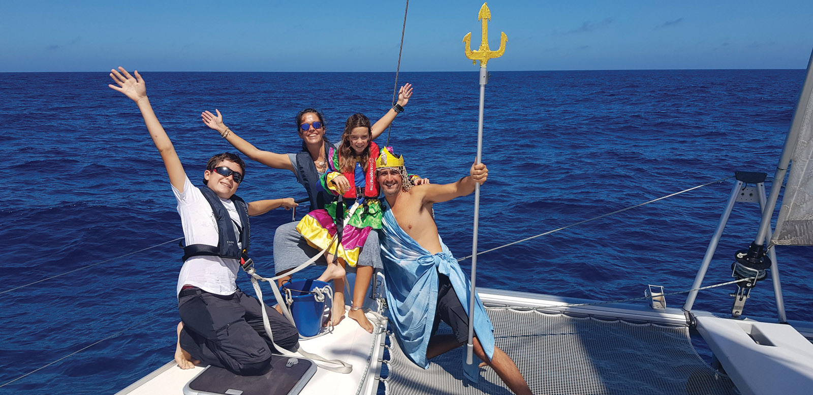 Le passage de l’équateur est prévu pour ce matin. On se prépare, on dirait que c’est le père Noël qui va passer, à bord, l’effervescence est à son maximum. Pour les marins non initiés, le premier passage de l’équateur est un moment particulier, et une petite « cérémonie » s’impose. On contacte Neptune par VHF pour lui demander s’il est disponible, mais il est en réunion. Il autorise Francesco à le remplacer. Quelques minutes plus tard, notre capitaine sort de sa cabine, réincarné en Neptune : toge bleue, couronne dorée et coquillage posé sur sa chevelure longue. Armé de son trident et d’un seau d’eau de mer, il nous baptise un à un sur le trampoline. On prépare ensuite notre bouteille à la mer avec nos dessins, lettres et offrandes pour Neptune. Chacun se voit remettre un diplôme de passage de l’équateur, puisque nous étions tous des novices. On avance à une bonne allure, les vagues viennent maintenant de trois quarts arrière, nous pouvons enfin ouvrir les capots de pont et aérer le catamaran. A l’intérieur, tout est humide, ça fait du bien. Une petite lessive sèche aussi au soleil, le grand luxe. Et là, d’un coup, « zzzzzzz », les deux cannes partent en même temps. On aperçoit dans le sillage une sorte de radeau flottant (un DCP, dispositif de concentration de poissons), Francesco pense que les leurres s’y sont accrochés et il demande un couteau pour tout couper. Le bruit des moulinets s’arrête… et repart : non, ce sont bien des poissons ! On remonte les lignes, bien organisés : belle surprise, d’abord un superbe wahoo, puis un beau thon de l’autre côté ! Neptune a exaucé nos vœux ! On lui verse à la mer un verre de rhum pour le remercier. Francesco nous sort des beaux filets et des darnes, on met les têtes de côté pour faire une belle soupe de poissons, Kissanga prend des allures de poissonnerie/conserverie. Le thon se retrouve immédiatement dans nos assiettes à midi avec des burgers de thon et frites maison d’ignames, un régal. L’aprèsmidi est consacré à la digestion, on s’octroie même une séance lecture bronzette à l’avant du bateau.