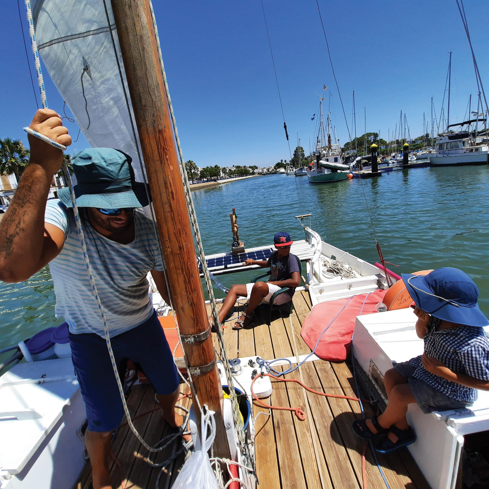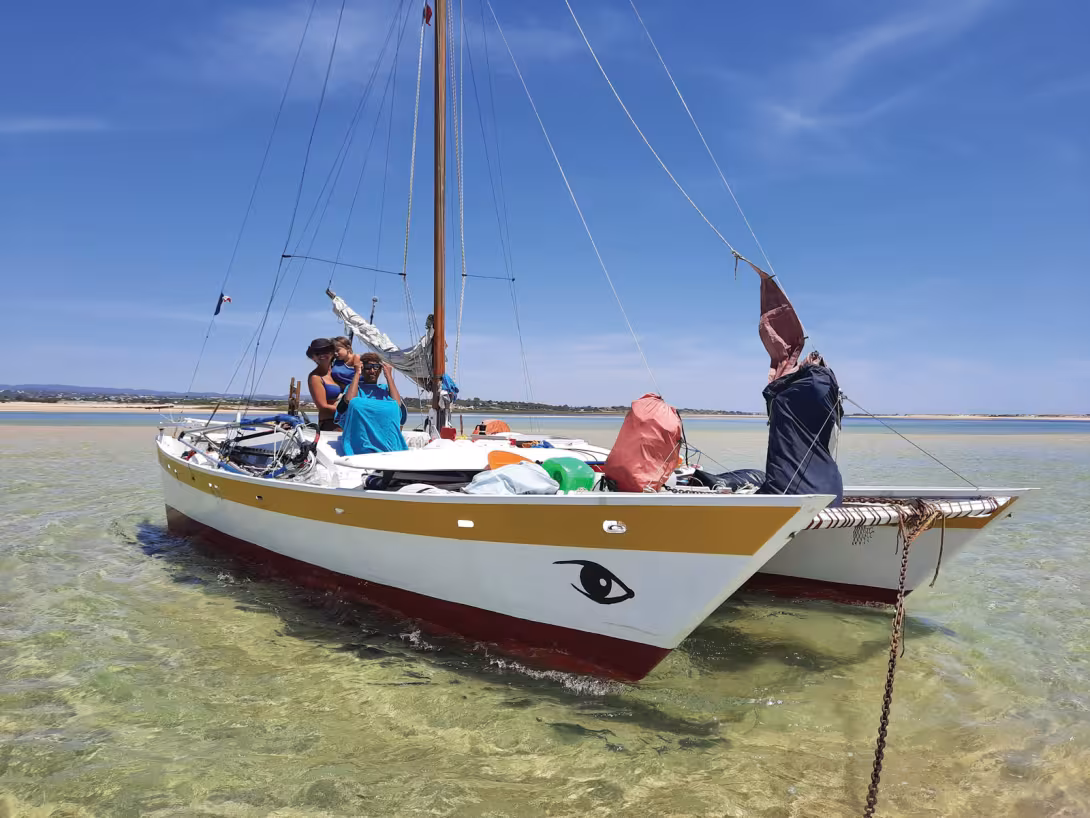 Notre première destination a été les Baléares. Nous avons profité avec délice des criques désertes et de la mer au bleu intense. En raison de la Covid, les contacts avec les gens se sont avérés difficiles, mais nous avons cependant fait de belles rencontres, notamment à Puerto Soller, sur l’île de Majorque. A Formentera, grâce à notre faible tirant d’eau de 50 cm, nous avons échappé à un fort coup de vent en nous réfugiant dans une lagune fermée, dans laquelle seules les barques de pêche et les jolies majorquines pénètrent. Ensuite, plusieurs journées de navigation intenses se sont enchaînées. Profitant de chaque fenêtre météo, nous avons accumulé les milles, nous relayant à la barre jour et nuit, car nous n’avons pas de pilote automatique, et le vent était bien trop changeant pour le régulateur d’allure. En approchant de Gibraltar, nous avons remonté une file interminable de cargos au mouillage. Pendant trois jours, le vent s’est fait attendre, puis soudain le Levante s’est levé, avec force, avec de violentes rafales, nous obligeant à affaler en urgence. A sec de toile, nous avancions encore à 4 nœuds. Ça a duré quelques dizaines de minutes, puis plus rien. Le vent a disparu, nous laissant ballottés par des vagues cassantes. Nous avons alors hissé de nouveau les voiles et, dix minutes plus tard, le vent était de retour, avec la même puissance… avant de disparaître de nouveau. Nous avons passé ainsi toute la nuit à manœuvrer, hissant et affalant sans arrêt les voiles. Au matin, épuisés, nous avons mouillé l’ancre au pied du fameux rocher. Deux jours plus tard, le détroit de Gibraltar était dans notre sillage. Heureux d’avoir pu tester le bateau dans de grosses conditions, nous avons fait halte pour quelques jours dans la belle cité de Cadix. Nous sommes alors partis nous abriter d’un coup de vent plus en amont sur la Guadiana, qui marque la frontière entre l’Espagne et le Portugal. Et c’est en haut de cette rivière, dans le petit village perché de Mertola, que nous avons fêté nos mille premiers milles, en compagnie d’une horde de motards portugais, sur un air de fado.