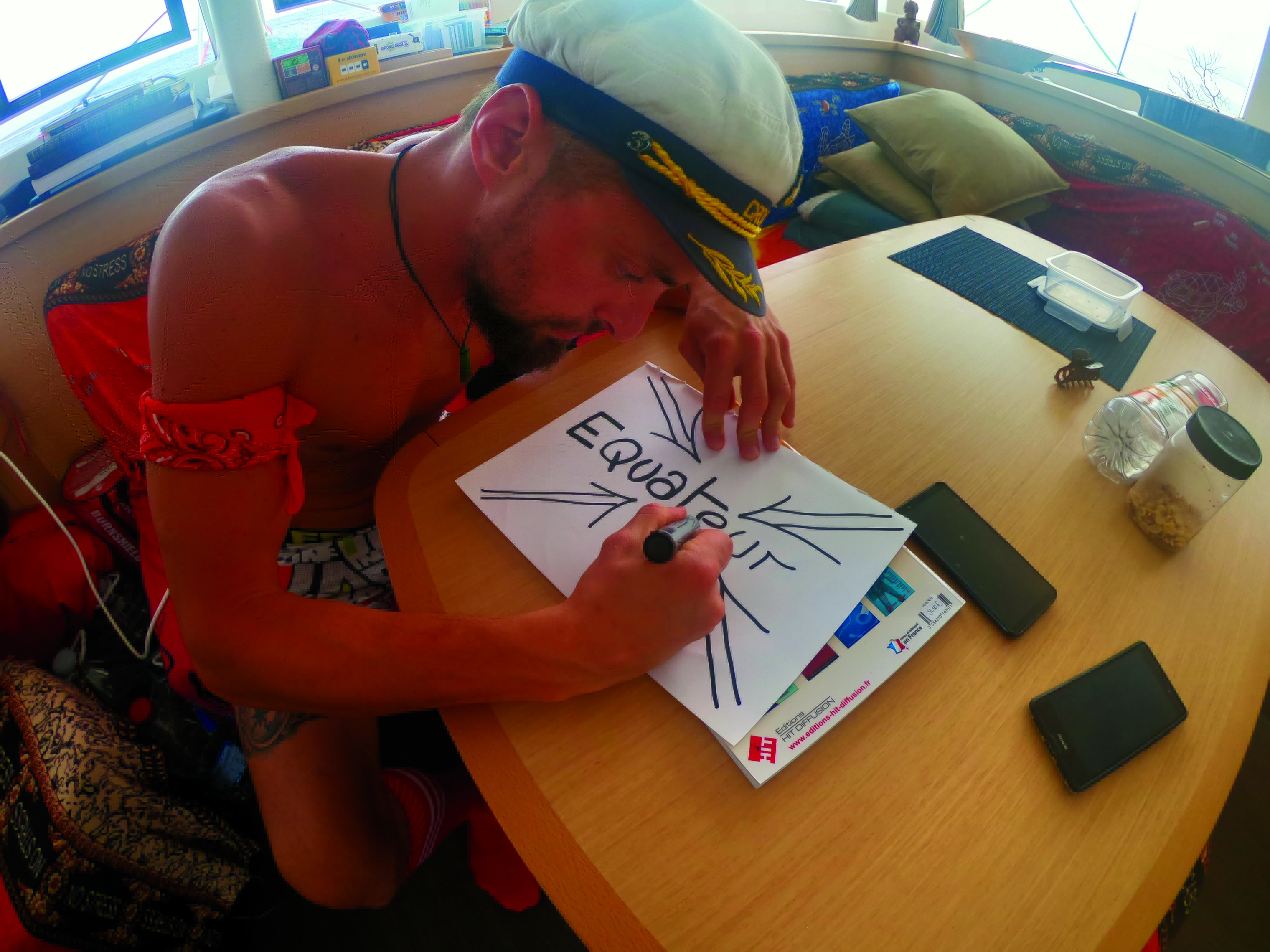 Heureusement, il reste les trampolines pour lézarder – avec en souvenir des grosses marques sur la figure ou sur les fesses… bref, une agréable et belle transatlantique jusqu’au Brésil, sans même trop se soucier des vents et des voiles, grâce aux alizés constants et majoritairement en notre faveur. Si on avait su ce que nous réserverait la transatlantique sud dans l’autre sens, on en aurait encore plus profité ! Le passage de l’équateur ? Un grand moment ! Au Cap-Vert, on avait acheté plein d’accessoires débiles dans un magasin chinois. Des chaussettes hautes de toutes les couleurs et des bandanas assortis pour tout le monde, une bouée vert fluo avec plein d’animaux farfelus dessus, des casquettes, une mannequin en plastique pour le Captain en guise de blague pour remplacer ma mère le temps du convoyage, et puis le plus important, notre mascotte officielle ! Un genre de mix entre un âne et un saucisson bleu à quatre pattes rapidement baptisé Gwiny – une longue histoire d’amour. Parés de tout cet attirail, on a préparé le champagne et notre hymne du bord, Oh Lala du groupe PNL. Le décompte pouvait commencer : 10, 9, 8, 7, 6, 5, 4, 3, 2, 1… ça y est, on a tous la tête à l’envers !