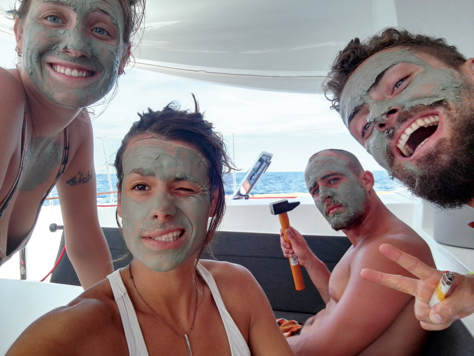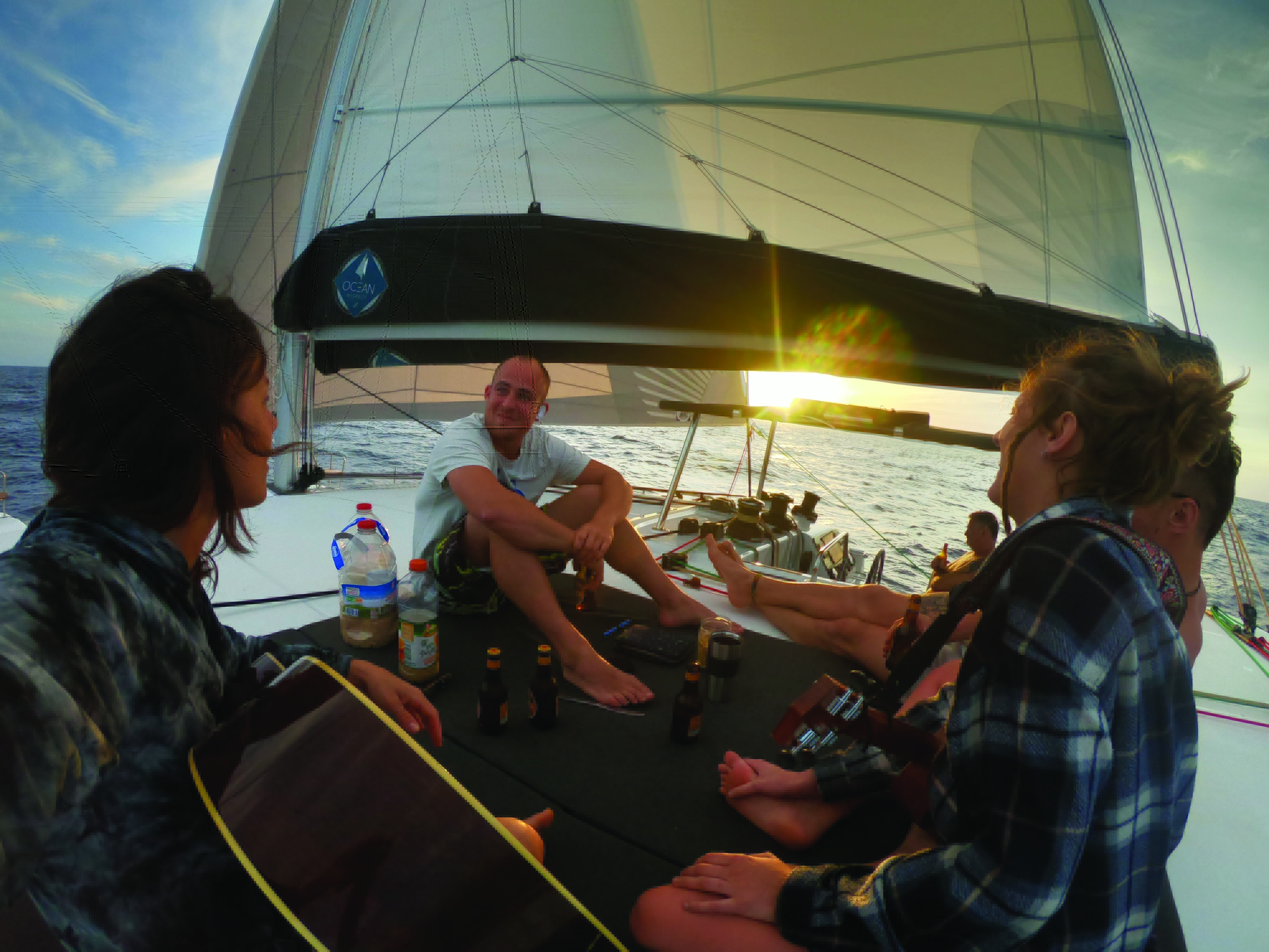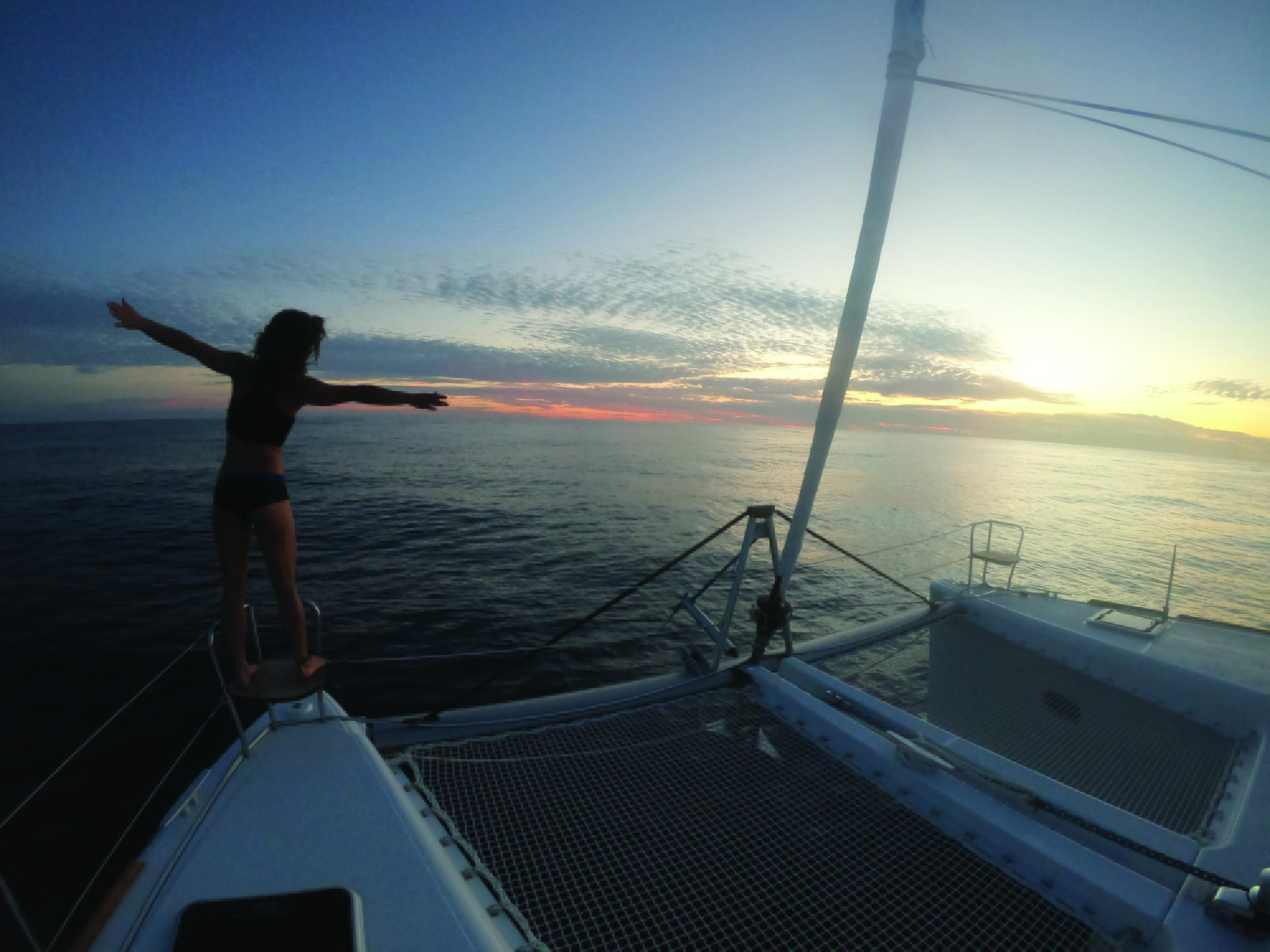 En mer, les occupations sont plus variées qu’on ne pourrait le penser : on mange, on dort, on cuisine, on joue, on fait du sport, on goûte, on admire, on lit, on apprend les nœuds, on refait le monde, on mate la météo, on met le gennaker, on enlève le gennaker, on empanne, puis on réempanne, on prend un ris, on fait du riz, et on recommence, pas forcément dans le même ordre... Tout ça agrémente nos belles journées. En fait, j’appréhendais beaucoup de me retrouver avec mon père, mon homme et mes meilleurs potes sur un catamaran. Il n’y a plus efficace comme test que la vie au large pour savoir si ça le fait avec quelqu’un ou non... Ou ça passe, ou ça casse. A bord, pas d’échappatoire – à part une des pointes avant ou encore la tête de mât pour les plus téméraires. On n’a pas d’autre choix que de se retrouver face à soi-même. Prendre sur soi et parler dès que l’on sent la moindre tension pour crever l’abcès direct, voilà pour moi la clef d’une relation saine et apaisée. C’est une belle expérience. Et quand ça marche, un lien magique se tisse, pour la vie. Mais ce n’est pas facile tous les jours : avec les caractères bien trempés que nous avons tous, il faut parfois mettre son ego de côté.