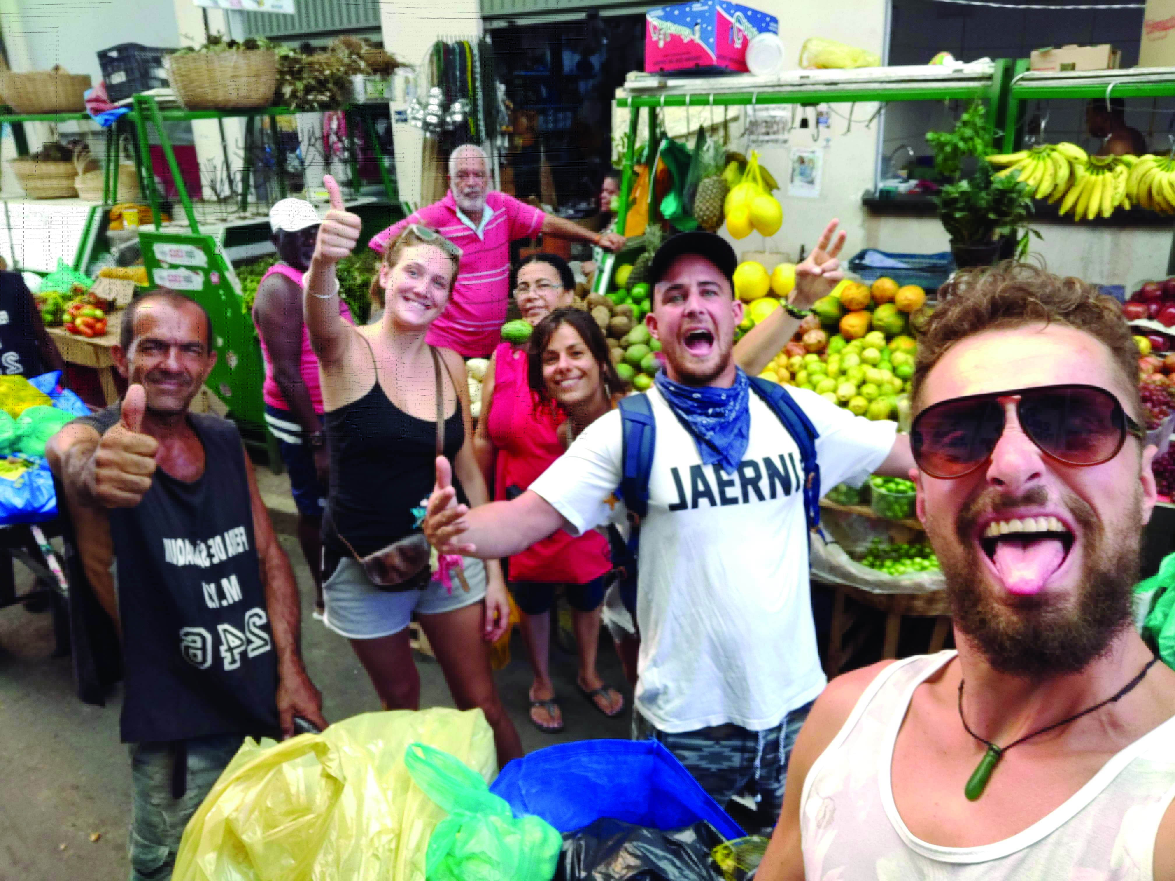 Notre séjour au Brésil a été bref – un peu trop à mon goût – et intense. Mais pas question de plaisanter avec l’Atlantique sud et ses dépressions qui rôdent. Notre objectif avant de larguer les amarres : faire nos provisions pour un mois de mer à l’incroyable marché Feira Sao Joaquim, surprenant en couleurs comme à l’odorat. Là, on a sympathisé avec les vendeuses et les brouettes men (les gars qui aident à porter les courses avec leur brouette). Ils ont halluciné de la quantité de trucs qu’on achetait ! J’avais beau leur expliquer notre périple, ils trouvaient tout ça improbable : c’est simple, je leur vidais leur étal, et même les stocks ! L’équipe en avait ras le bol, sauf mon amour de César, que rien ne fatigue et n’épuise. J’ai terminé la razzia par une quarantaine de bouteilles de cachaça – rhum brésilien connu pour son cocktail caïpirinha, un favori à bord de Maitai. Sans mentir, on est revenu avec 100 kilos de fruits et légumes, facile. Tout y était : mangues, noix de coco, ananas, fruits de la passion, papayes, goyaves, épinards, salades, potirons, butternut, haricots. Il y avait même des trucs que j’ai achetés sans savoir ce que c’était ! Quand le Captain nous a vus arriver avec tout ça, il nous a regardés bouche bée – heureusement que César et Max n’ont finalement pas acheté la chèvre qu’il voulait ramener sur Maitai pour lui faire une blague ! Mes compères ont répondu à son regard hébété en disant en même temps : « C’est Alizé. » Les rigolos. Ils me remercieraient plus tard avec du frais jusqu’au dernier jour de nav’, va ! On a assemblé des filets pour ranger tout ça tant bien que mal et on a tout passé à la javel pour éviter les petites bêtes malvenues à bord de Maitai. De son côté, mon père a embarqué 15 bidons de 20 litres en plus du plein de gazole, histoire d’être tranquille et d’anticiper la pétole, toujours possible.