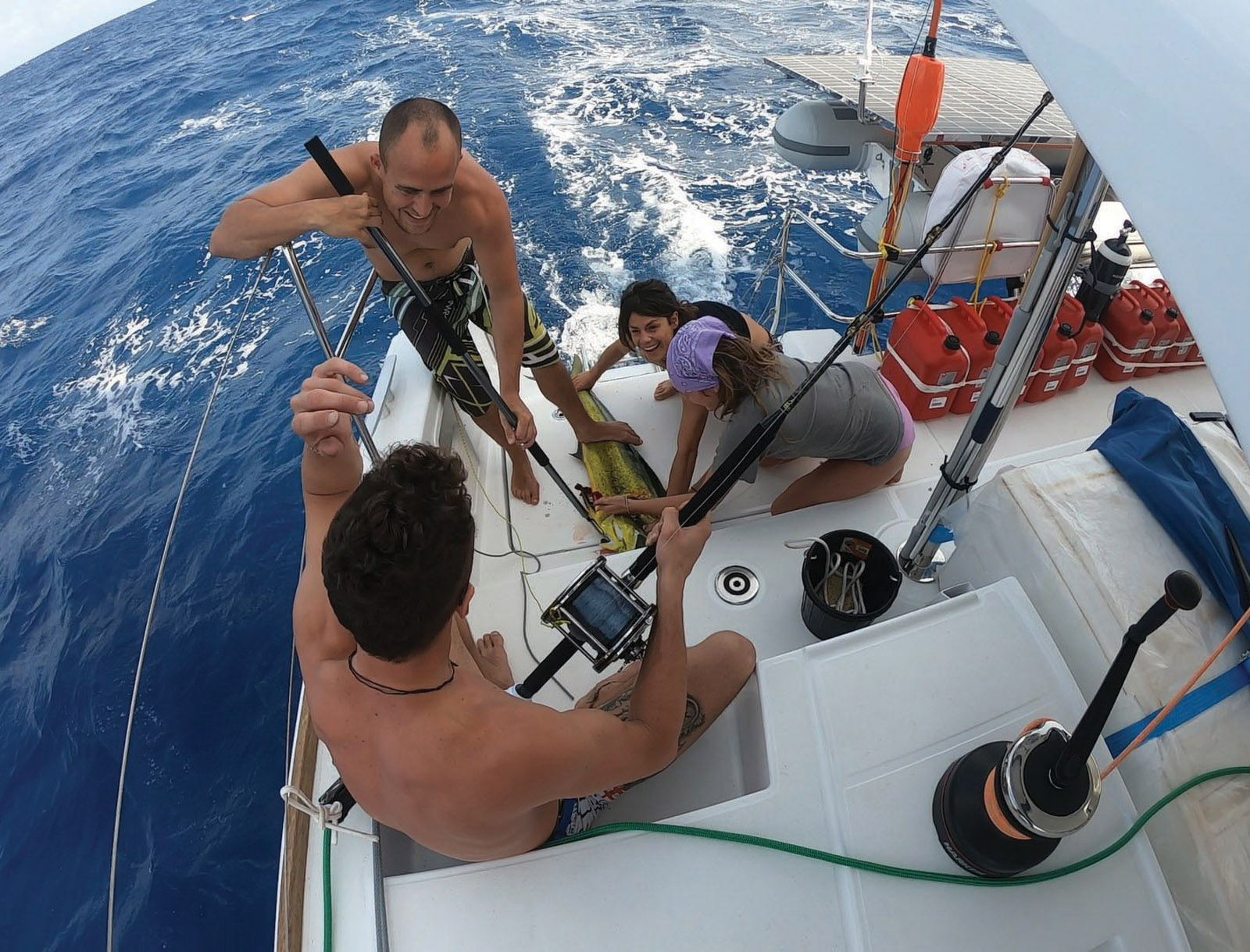 A bord de Maitai, nous nous complétons plutôt bien ; de vraies petites fourmis ! Il n’y en a jamais un qui fait plus ou moins que les autres. Et dès qu’il s’agit de manger, on est tous chauds. Un d’entre nous coupe les courgettes pendant que le deuxième pêche le poisson, le troisième lave la salade et le dernier épluche le concombre. On doit bien passer deux heures par jour chacun à mitonner de bons petits plats. Ce qui est super, c’est que le catamaran est suréquipé niveau matos de cuisine et énergie, alors on peut se faire plaisir et utiliser tous les instruments que l’on veut. Merci aux trois panneaux solaires avec leurs 990 W ! Au programme : gâteaux, salades multicolores, pain maison, pancakes, cakes à tout, lentilles, soupes de potiron, entremets, gratins, pizzas, rillettes de poisson « maison » avec la pêche du jour, eh oui, Messieurs ! Bon, on a quand même l’avantage d’avoir une chef cuistot 4 étoiles à bord, merci Lisa ! Ah on le bichonne, notre Captain ! Ça nous rattrape de tous ces moments où on crie et on saute partout. Ou encore de toutes les conneries qu’on raconte…