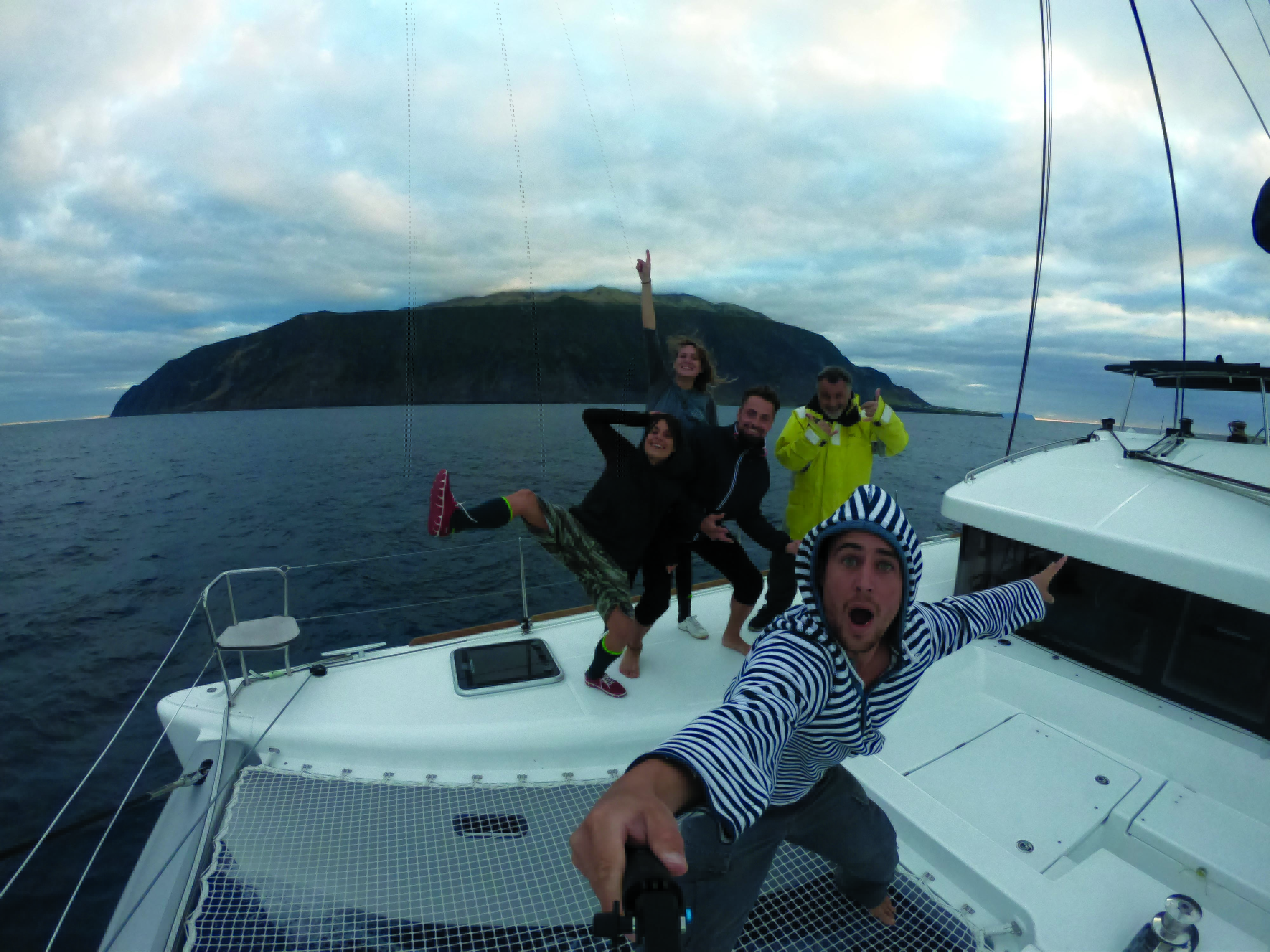 Max et Lisa ont fini par se réveiller. Je ne sais pas comment ils ont fait pour ne pas sortir de leur cabine : à l’avant, c’était le parc Astérix ! Ils n’ont pas trop fermé l’œil eux non plus. Du coup, ils se sont levés et nous ont retrouvés dans le carré tous les trois, César, mon père et moi – avec le Ricard et l’andouillette. Ben oui, on ne se laisse pas abattre ! Le vent a commencé à baisser d’un cran avec le jour. Bilan de cette nuit difficile : on s’est fait arracher notre antenne VHF. On pensait avoir perdu également la girouette anémo, mais le vent est revenu d’un coup sur les instruments. Ce devait juste être un faux contact… Au final, on a perdu deux jours, car nous sommes bien remontés de 100 milles au-dessus de la route en restant en fuite – au moins, on n’a pas abîmé le cata. L’avantage de ce « petit » crochet, c’est que Tristan Da Cunha s’est retrouvée sur notre route. Une escale imprévue devient possible chez les habitants les plus isolés du monde, paraît-il. 277 habitants, dont 7 familles, y vivent. Le Captain aurait peut-être préféré ne pas s’arrêter, car le mouillage est réputé rouleur. En moyenne, seulement cinq bateaux par an s’arrêtent sur cet archipel oublié. L’une des îles se nomme même « Inaccessible Island », ça donne une petite idée !