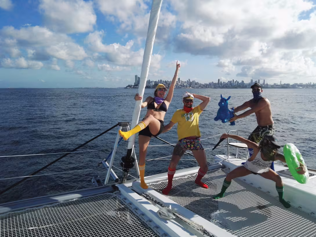 On est arrivés au petit matin au Brésil. J’adore sentir l’odeur de la terre avant même de l’apercevoir à l’horizon, surtout après deux semaines de mer. Avant notre amarrage à la petite marina Terminal Nautico de Salvador, juste en face du Mercado Modelo, nous avons bien sûr revêtu nos fameuses tenues. Pas la peine de vous préciser qu’on n’est pas passés incognito et qu’on a bien fait rire Dominique, le gérant de la marina…