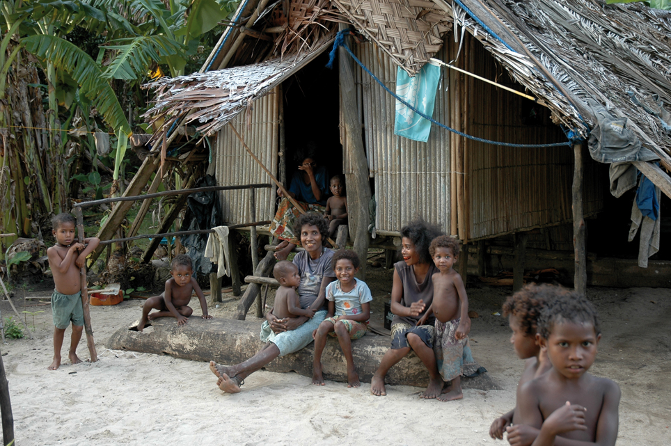 Voilà notre premier Papou qui approche dans sa petite pirogue à balancier, la pagaie à la main. Il a l’air gentil, mâche du bétel, ce qui lui fait une bouche ensanglantée vraiment rassurante, et parle quelques mots d’anglais : c’est John, le chef du village, un petit gabarit aux yeux malicieux. Il fait connaissance avec nous, prudemment, ne s’impose pas, mais on le sent curieux. Il est venu voir qui arrivait dans son île. Les contacts humains aux Louisiades seront comme ça, empreints de réserve, plus distants qu’au Vanuatu. La langue est aussi un problème, l’anglais est moins parlé que les dialectes locaux. Nous indiquons à John que nous irons visiter son village quand le soleil sera un peu moins haut. En attendant, il nous indique que nous pouvons nous baigner dans la baie, il y a bien sûr quelques requins, mais généralement non agressifs, et pas de crocodiles à Nimoa, où il n’y a pas de mangrove. Bonne nouvelle. Plus tard, nous débarquons sur la petite plage. Tous les villageois nous observent. Nous ne ressentons pas d’agressivité, non, aucune, c’est simplement qu’il existe un monde de différences entre eux et nous, entre leur civilisation, leur mode de vie, leur niveau de développement, et les nôtres. Et chacun le sait. John nous présente sa femme, qui nous adresse un grand sourire également rouge sang de bétel, moyennement sexy, on va dire, et ses fils, qui travaillent, avec d’autres jeunes garçons, à remettre en état une grande pirogue à voile tirée sur des rondins de bois devant les cases. Les enfants sont nombreux, mais eux aussi sont réservés. Ils ont facilement peur de nous. Un geste un peu brusque, et les voilà qui détalent. Les cases ici sont toutes surélevées, et il doit faire bon y dormir, à même les nattes, dans le souffle de l’alizé. Des petites cases séparées servent de cuisine à proximité des cases d’habitation. On y retrouve la panoplie habituelle des gamelles en fer blanc et des bouilloires noircies de fumée, accompagnées d’ustensiles taillés dans le bois. Les coutelas et les machettes sont nombreux, les hommes en ont toujours un avec eux, dont ils se servent tout le temps, et pour tout faire. Les Papous utilisent beaucoup les fibres végétales de la forêt, qui leur servent à réaliser les ligatures utilisées couramment dans leur vie quotidienne, pour leurs habitations, leurs embarcations, leurs cultures.